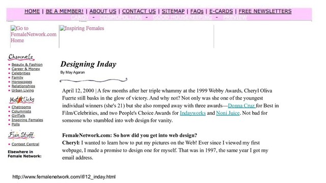 FemaleNetwork.com - Designing Inday is an article by May Agaran published on April 12, 2000 under the "Inspiring Females" section of FemaleNetwork.com.