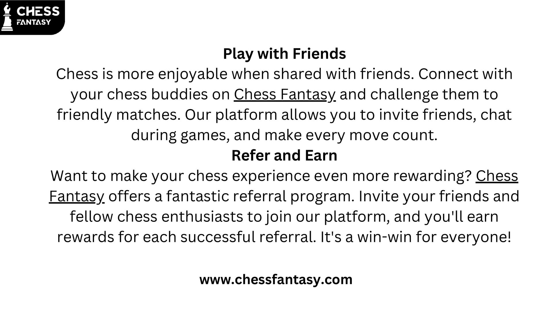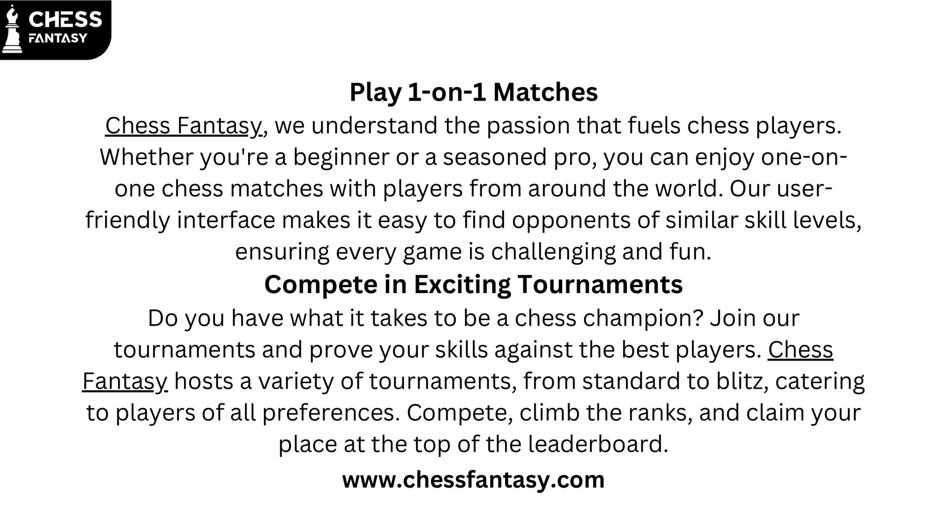 Are you a chess enthusiast looking for the perfect online platform to elevate your chess game, challenge friends, and engage in thrilling tournaments? Look no further than Chess Fantasy, your go-to destination for an immersive chess experience! Visit us- https://chessfantasy.com/