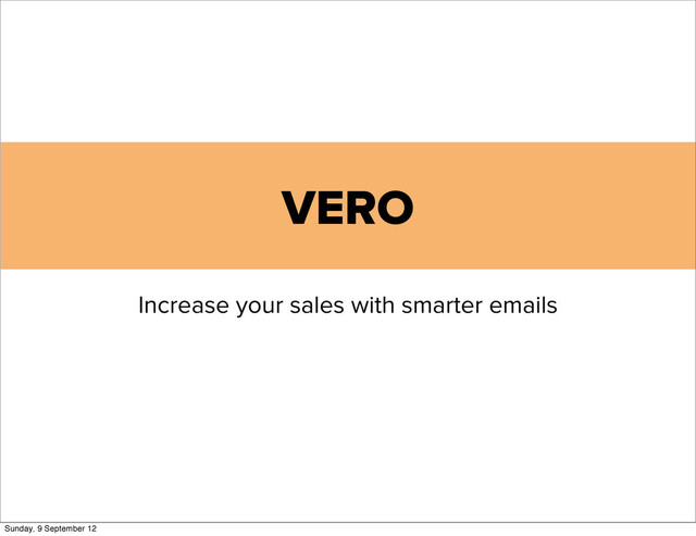 message at the right time results in higher conversions and increased customer satisfaction. Vero enables business owners to send one-to-one, targeted emails when selling to hundreds, thousands or even millions of people. Sunday, 9 September 12