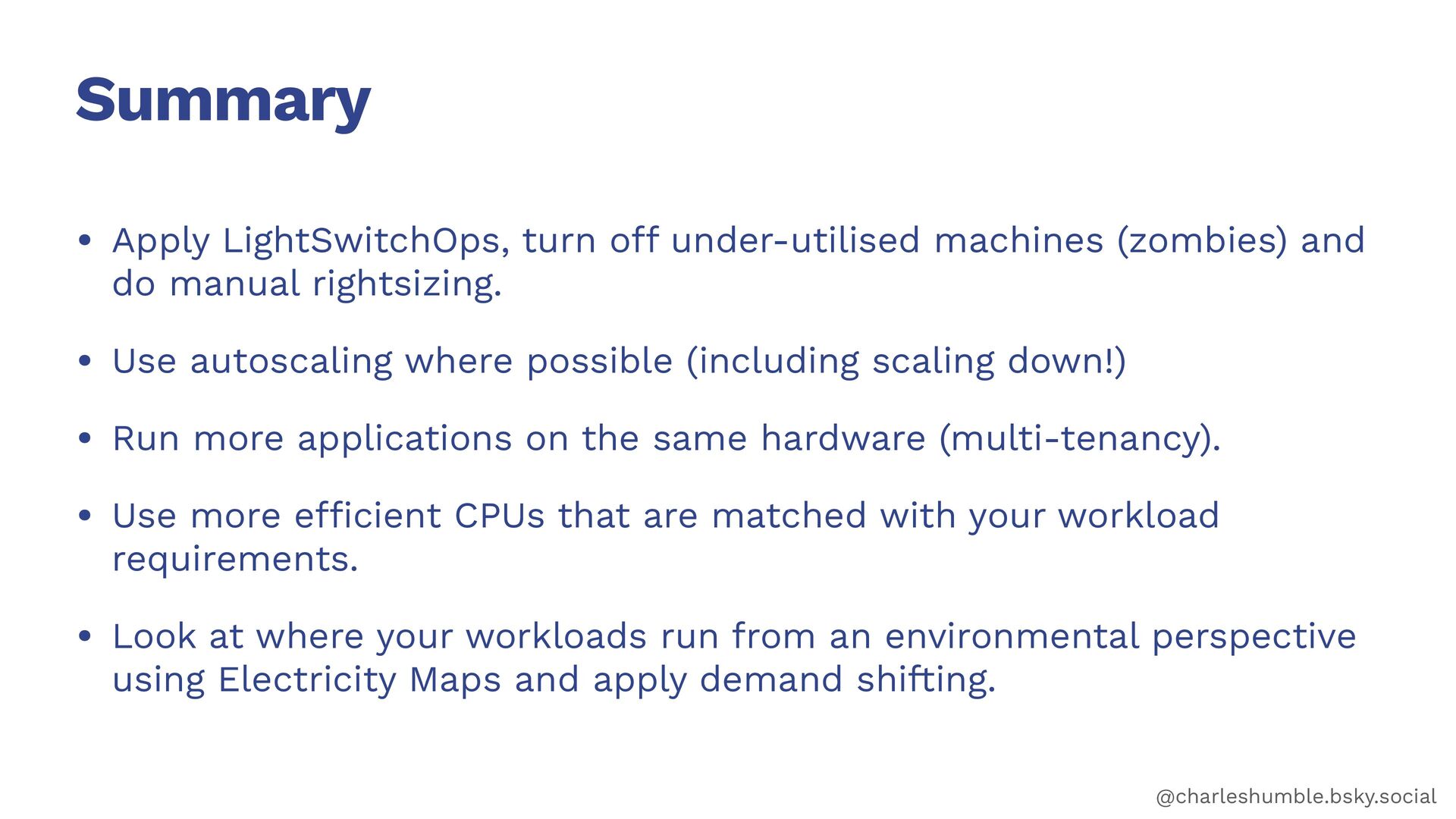 There is a real efficiency advantage in high compute density via managed cloud services. Such services, which can share resources between thousands or millions of users, can achieve extremely high hardware and energy utilisation. Because of this, an awful lot of the still rather limited publicly available material on writing software with sustainability in mind emphasises shifting to cloud services. But what happens if you can’t?