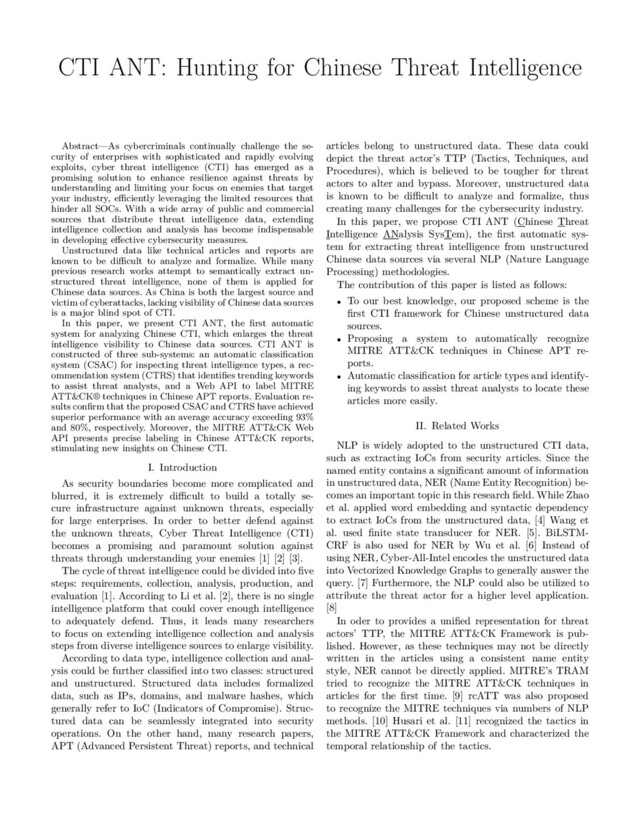 related to cryptography, authen- tication, and network application vulnerability. Therefore, these topics could provide a higher level of meaning for security experts. We could observe from Figure 5 that there are still some too-common keywords (e.g., argument, information security, and step). These keywords only provide rare information. Thus removing these keyword could further improve the effectiveness of CTRS. While there is no ground truth available to evaluate CTRS, the results are manually reviewed by security experts. The evaluation shown in Table II indicates that the ratio of finding related topics is 75% for vulnerability articles and 85% for Enterprise Security articles. This eval- uation demonstrates that CTRS can provide meaningful hints for security experts to quickly capture the topics of the article. TABLE II: Evaluation result of CTRS topic non-relative high medium low Vulnerabilities 5 4 4 7 Enterprise Security 3 6 7 4 V. Conclusion As we mentioned in the introduction, the lack of Chi- nese threat intelligence visibility creates a blind spot for CTI. Additionally, highly-active Chinese security forums provide fertile sources for intelligence. In this paper, CTI ANT, a novel prototype for Chinese CTI analysis is proposed to enlarge the threat intelligence visibility and analysis capability to Chinese data sources. In addition to the quantitative performance measure- ments mentioned in the evaluations section, here we highlight the findings from our study: 1) Cyber Security Article Classifier (CSAC): We have established an automatic classification system that assists security analysts to quickly identify the theme of cyber threat data, a significant step towards Chinese CTI gathering and updating. 2) Cyber Topic Recommendation System (CTRS): It determines the inter-similarity of prevalent security- related keywords and clusters them to distinct cy- bersecurity topics. Not only does the CTRS results assist threat analysts in identifying key threat actors to deploy appropriate security controls, but the results have also revealed intrinsic connections across various keywords. 3) MITRE ATT&CK Detector (MD): We respectively analyzed various classification models to automat- ically recognize MITRE ATT&CK techniques in Chinese APT reports, facilitating the design of bet- ter cyber defense mechanisms for multiple domains. Through the visualization of MITRE ATT&CK detections in heatmap format, we have further un- covered the imbalance of Chinese MITRE ATT&CK data and proposed adjustment strategies to enable higher-efficiency results for future Chinese CTI in- spection. References [1] D. Chismon and M. Ruks, “Threat intelligence: Collecting, analysing, evaluating,” MWR InfoSecurity Ltd, 2015. [2] V. G. Li, M. Dunn, P. Pearce, D. McCoy, G. M. Voelker, and S. Savage, “Reading the tea leaves: A comparative analysis of threat intelligence,” in 28th {USENIX} Security Symposium ({USENIX} Security 19), 2019, pp. 851–867. [3] S. Samtani, M. Abate, V. Benjamin, and W. Li, “Cybersecurity as an industry: A cyber threat intelligence perspective,” The Palgrave Handbook of International Cybercrime and Cyberde- viance, pp. 135–154, 2020. [4] J. Zhao, Q. Yan, J. Li, M. Shao, Z. He, and B. Li, “Timiner: Au- tomatically extracting and analyzing categorized cyber threat intelligence from social data,” Computers & Security, p. 101867, 2020. [5] T. Wang and K. P. Chow, “Automatic tagging of cyber threat intelligence unstructured data using semantics extraction,” in 2019 IEEE International Conference on Intelligence and Secu- rity Informatics (ISI). IEEE, 2019, pp. 197–199. [6] H. Wu, X. Li, and Y. Gao, “An effective approach of named entity recognition for cyber threat intelligence,” in 2020 IEEE 4th Information Technology, Networking, Electronic and Au- tomation Control Conference (ITNEC), vol. 1. IEEE, 2020, pp. 1370–1374. [7] S. Mittal, A. Joshi, and T. Finin, “Cyber-all-intel: An ai for security related threat intelligence,” arXiv preprint arXiv:1905.02895, 2019. [8] L. Perry, B. Shapira, and R. Puzis, “No-doubt: Attack attri- bution based on threat intelligence reports,” in 2019 IEEE In- ternational Conference on Intelligence and Security Informatics (ISI). IEEE, 2019, pp. 80–85. [9] MITRE, Threat Report ATT&CK® Mapping (TRAM), 2019 (accessed October 4, 2020). [Online]. Available: https: //github.com/mitre-attack/tram [10] V. Legoy, “rcatt: Retrieving att&ck tactics and techniques in cyber threat reports,” FIRST Cyber Threat Intelligence Symposium, 2020. [11] G. Husari, E. Al-Shaer, B. Chu, and R. F. Rahman, “Learning apt chains from cyber threat intelligence,” in Proceedings of the 6th Annual Symposium on Hot Topics in the Science of Security, 2019, pp. 1–2. [12] FreeBuf, 2012 (accessed October 15, 2020), https://www. freebuf.com/. [13] VULHUB, 2012 (accessed October 15, 2020), http://vulhub. org.cn/attack. [14] Simplified Chinese Stop Word list, 2019 (accessed Octo- ber 15, 2020), https://github.com/goto456/stopwords/blob/ master/cn_stopwords.txt. [15] F. Pedregosa, G. Varoquaux, A. Gramfort, V. Michel, B. Thirion, O. Grisel, M. Blondel, P. Prettenhofer, R. Weiss, V. Dubourg, J. Vanderplas, A. Passos, D. Cournapeau, M. Brucher, M. Perrot, and E. Duchesnay, “Scikit-learn: Ma- chine learning in Python,” Journal of Machine Learning Re- search, vol. 12, pp. 2825–2830, 2011. [16] C. Sumiyoshi, H. Fujino, T. Sumiyoshi, Y. Yasuda, H. Ya- mamori, M. Fujimoto, and R. Hashimoto, “Semantic memory organization in japanese patients with schizophrenia examined with category fluency,” Frontiers in Psychiatry, vol. 9, p. 87, 2018. [17] X. Liao, K. Yuan, X. Wang, Z. Li, L. Xing, and R. Beyah, “Acing the ioc game: Toward automatic discovery and analysis of open- source cyber threat intelligence,” in Proceedings of the 2016 ACM SIGSAC Conference on Computer and Communications Security, ser. CCS ’16. New York, NY, USA: Association for Computing 
