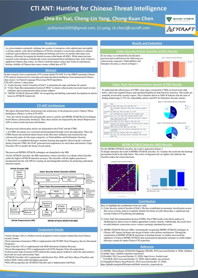 challenge the security of enterprises with sophisticated and rapidly evolving exploits, cyber threat intelligence (CTI) has emerged as a promising solution to enhance resilience against threats by understanding and limiting your focus on enemies that target your industry, efficiently leveraging the limited resources that hinder all SOCs. While many previous research works attempt to semantically extract unstructured threat intelligence data, none of them is applied for Chinese data source. As China is both the largest source and victim of cyberattacks, lacking visibility of Chinese data source creates a blind spot of CTI. Problem Results and Evaluation To understand the effectiveness of CTRS, some topics extracted by CTRS are listed in the table below, where the original Chinese and translated English are both listed for reference. The results are manually reviewed by security experts. The evaluation shown in Table II indicates that the ratio of finding related topic is 75% for vulnerability articles and 85% for Enterprise Security articles. The figure illustrated below demonstrates the architecture of the proposed system: Chinese Threat Intelligence ANalysis sysTem (CTI ANT) First, the Article Scraper(AS) automatically retrieves articles and MITRE ATT&CK® [1] techniques from Chinese cybersecurity forums[2]. Then, these articles are inspected by the Article Preprocessor (AP) to remove irrelevant noise information. The processed cybersecurity articles are dispatched to the CSAC and the CTRS. 1. In CTRS, the articles are vectorized and disintegrated through vector decomposition. Then, the CTRS clusters the technical tokens based on the their inter-similarity and extracted the top cybersecurity topics for the target categories: a) Vulnerabilities and b) Enterprise Security. 2. The CSAC is established through a machine learning data pipeline. Receiving the vectorized articles from the CTRS, the CSAC generated term importance for each token and trained a Topic Classifier (TC) to predict the theme of each article. The processed MITRE ATT&CK techniques are dispatched to the MD. 3.In the ATT&CK classifier, the MD experiments various classifiers to evaluate which classifier yields the highest ATT&CK detection accuracy. The classifier with the highest precision is incorporated into the web API for creating an interchangeable interface for producing cyberattack detection reports.