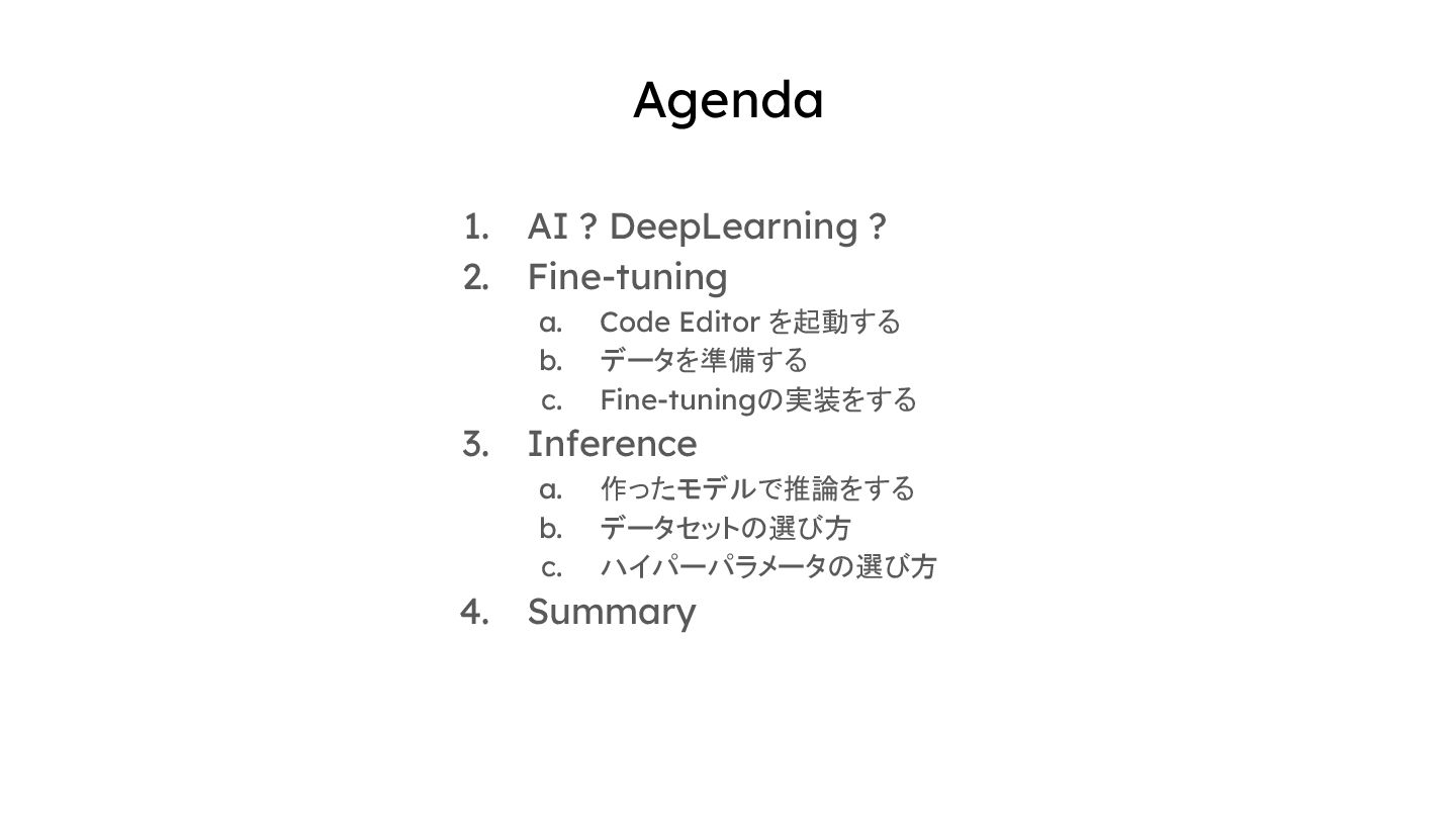 Editor を起動する b. データを準備する c. Fine-tuningの実装をする 3. Inference a. 作ったモデルで推論をする b. データセットの選び方 c. ハイパーパラメータの選び方 4. Summary