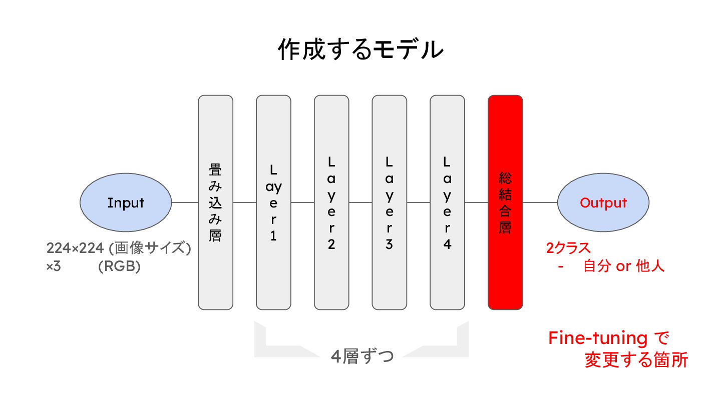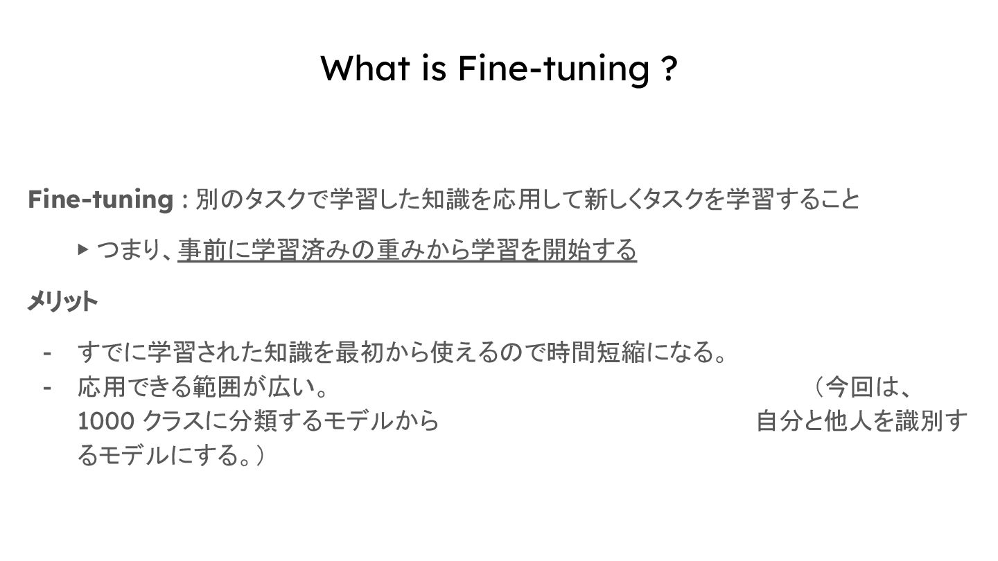 - すでに学習された知識を最初から使えるので時間短縮になる。 - 応用できる範囲が広い。 (今回は、 1000 クラスに分類するモデルから 自分と他人を識別す るモデルにする。)