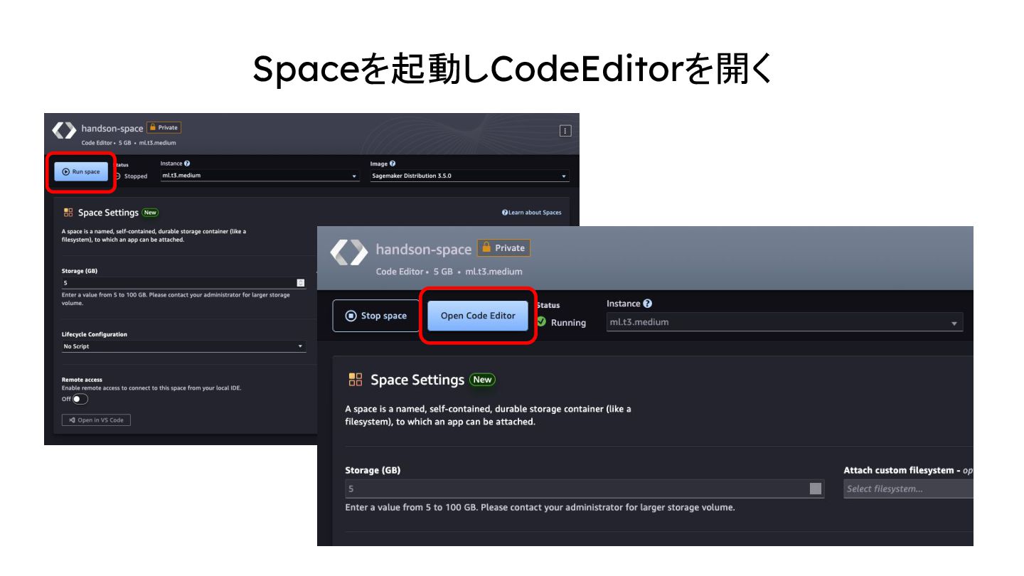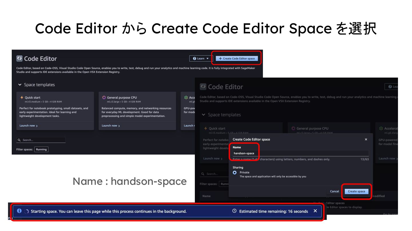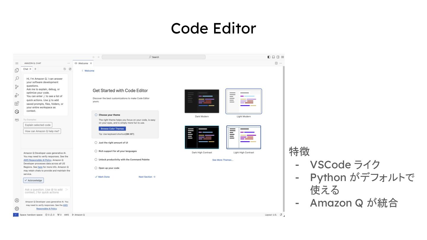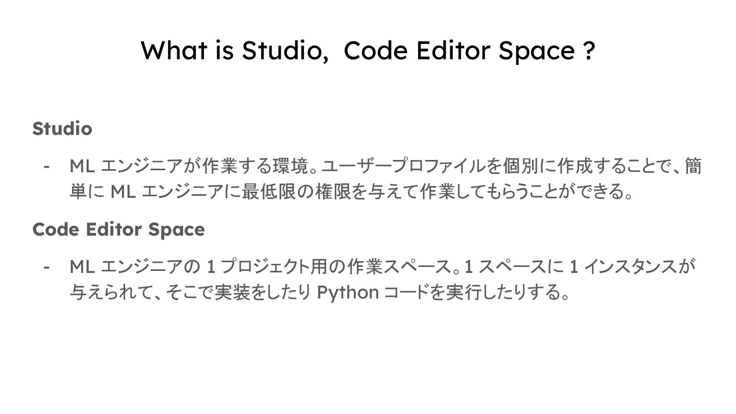 エンジニアが作業する環境。ユーザープロファイルを個別に作成することで、簡 単に ML エンジニアに最低限の権限を与えて作業してもらうことができる。 Code Editor Space - ML エンジニアの 1 プロジェクト用の作業スペース。1 スペースに 1 インスタンスが 与えられて、そこで実装をしたり Python コードを実行したりする。