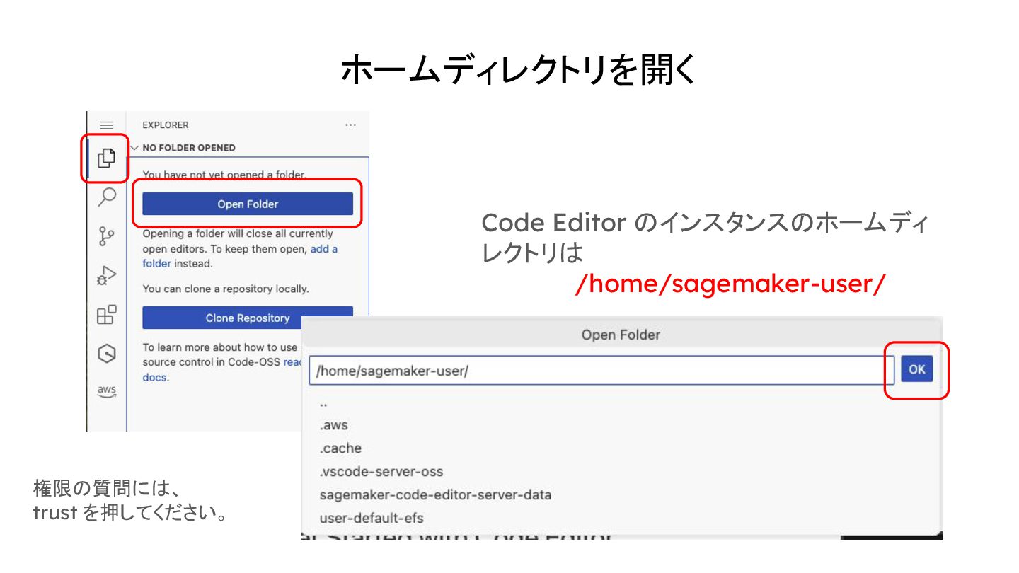 ホームディレクトリを開く Code Editor のインスタンスのホームディ レクトリは /home/sagemaker-user/ 権限の質問には、 trust を押してください。