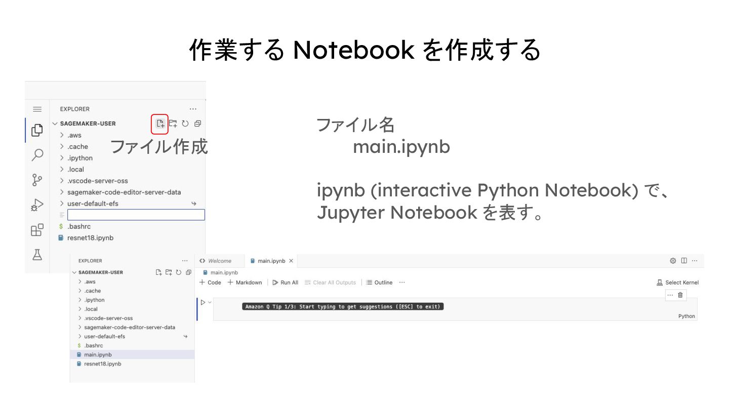 作業する Notebook を作成する ファイル名 main.ipynb ipynb (interactive Python Notebook) で、