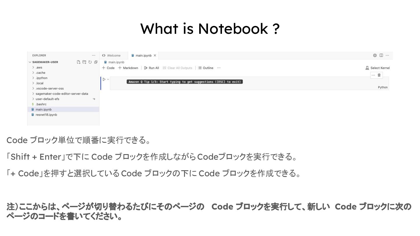 What is Notebook ? Code ブロック単位で順番に実行できる。 「Shift + Enter」で下に Code