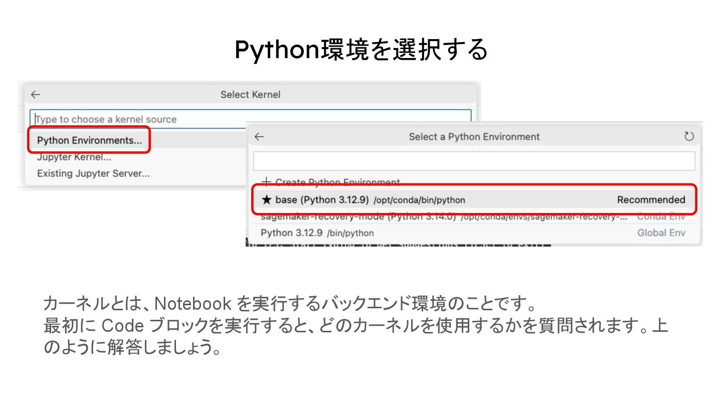 Python環境を選択する カーネルとは、Notebook を実行するバックエンド環境のことです。 最初に Code ブロックを実行すると、どのカーネルを使用するかを質問されます。上 のように解答しましょう。
