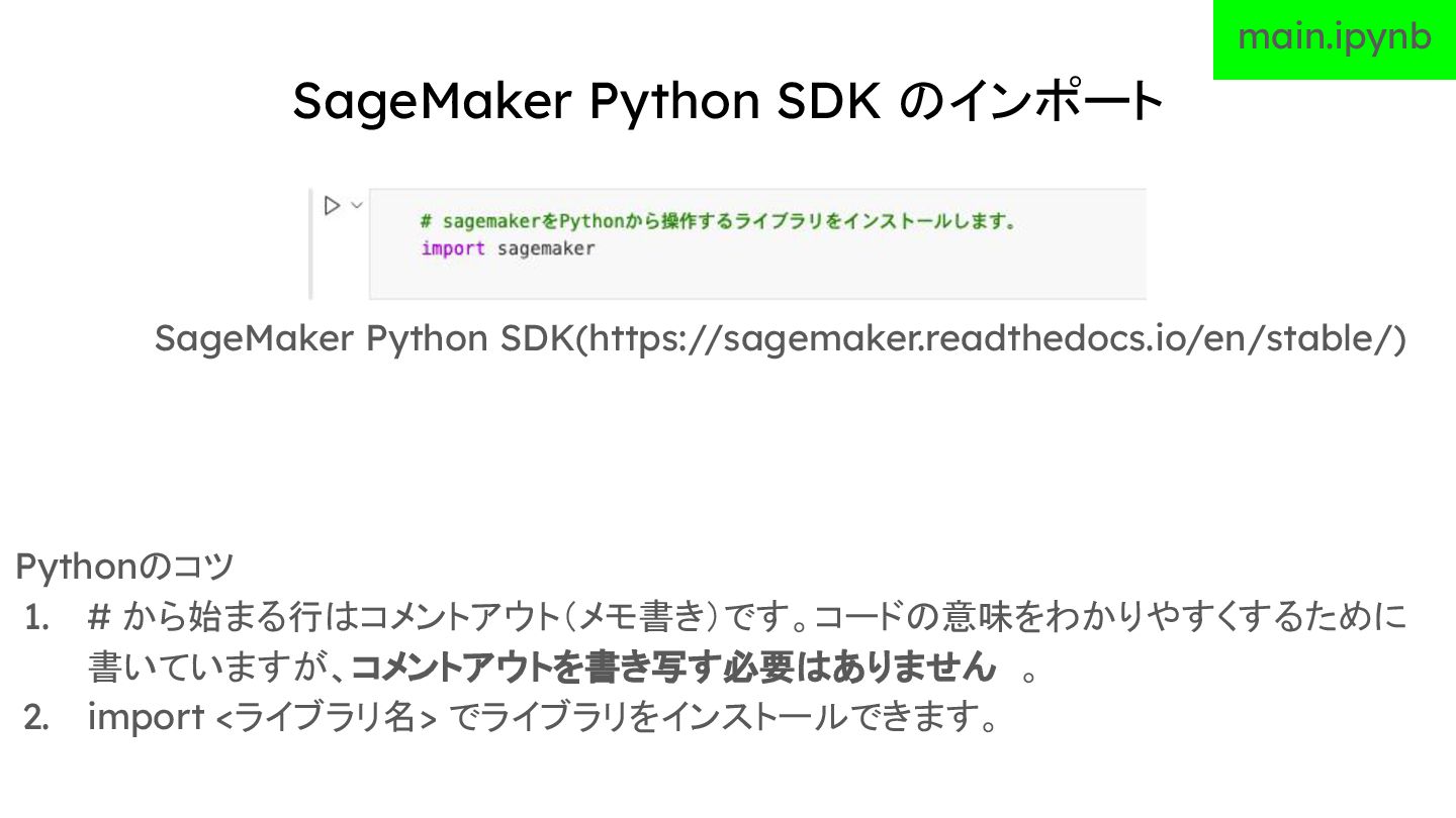 SageMaker Python SDK のインポート Pythonのコツ 1. # から始まる行はコメントアウト(メモ書き)です。コードの意味をわかりやすくするために 書いていますが、コメントアウトを書き写す必要はありません 。