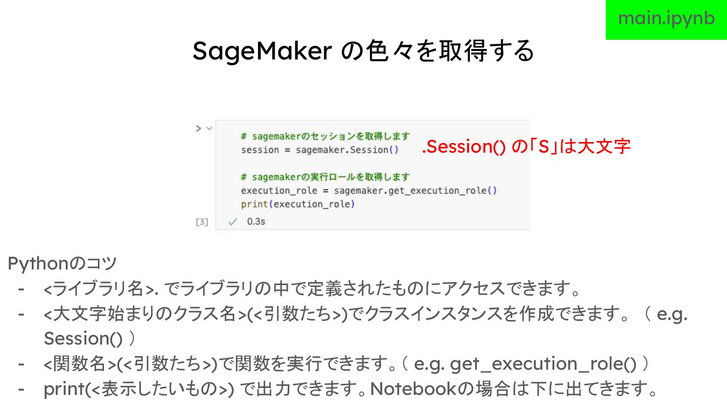 Session() ) - <関数名>(<引数たち>)で関数を実行できます。( e.g. get_execution_role() ) - print(<表示したいもの>) で出力できます。Notebookの場合は下に出てきます。 main.ipynb .Session() の「S」は大文字