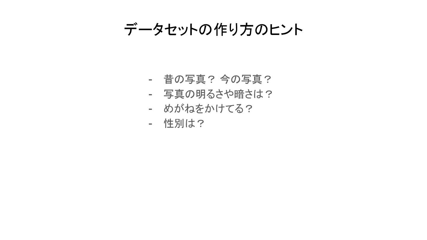 データセットの作り方のヒント - 昔の写真? 今の写真? - 写真の明るさや暗さは? - めがねをかけてる? - 性別は?