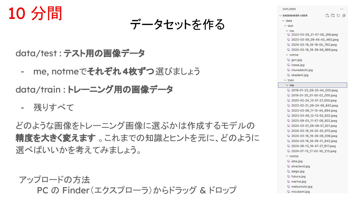 - 残りすべて どのような画像をトレーニング画像に選ぶかは作成するモデルの 精度を大きく変えます 。これまでの知識とヒントを元に、どのように 選べばいいかを考えてみましょう。 アップロードの方法 PC の Finder(エクスプローラ)からドラッグ & ドロップ 10 分間