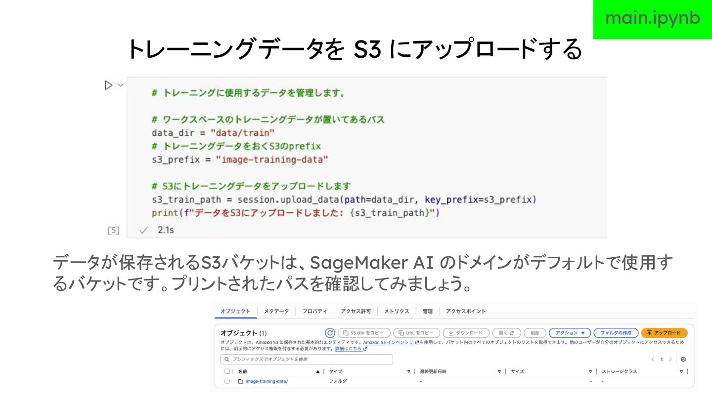 トレーニングデータを S3 にアップロードする データが保存されるS3バケットは、SageMaker AI のドメインがデフォルトで使用す るバケットです。プリントされたパスを確認してみましょう。 main.ipynb