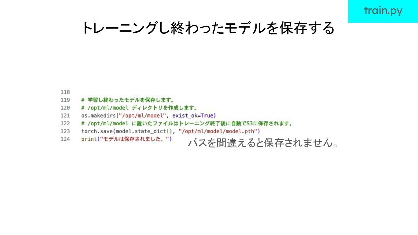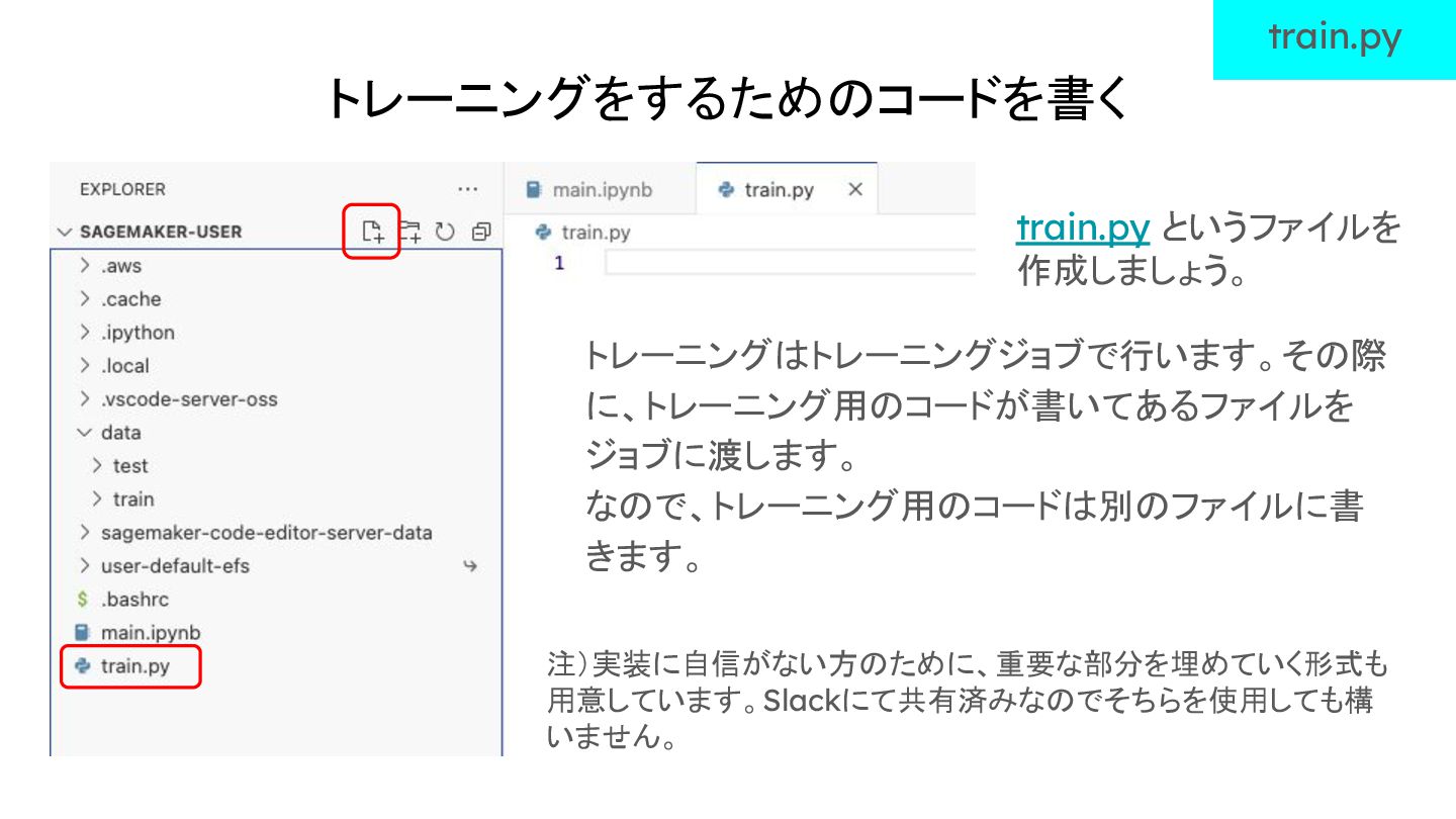 トレーニングをするためのコードを書く train.py というファイルを 作成しましょう。 train.py トレーニングはトレーニングジョブで行います。その際 に、トレーニング用のコードが書いてあるファイルを ジョブに渡します。 なので、トレーニング用のコードは別のファイルに書 きます。