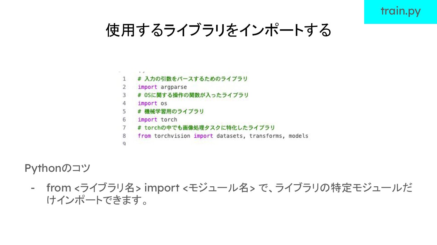 使用するライブラリをインポートする Pythonのコツ - from <ライブラリ名> import <モジュール名> で、ライブラリの特定モジュールだ けインポートできます。 train.py