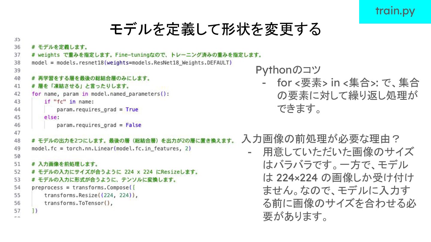 モデルを定義して形状を変更する train.py Pythonのコツ - for <要素> in <集合>: で、集合 の要素に対して繰り返し処理が