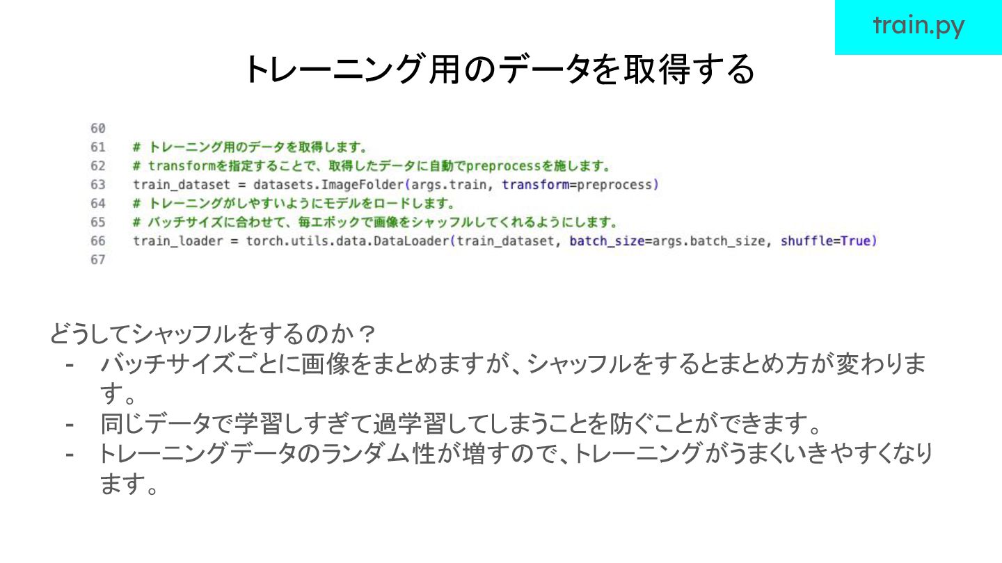 トレーニング用のデータを取得する train.py どうしてシャッフルをするのか? - バッチサイズごとに画像をまとめますが、シャッフルをするとまとめ方が変わりま す。 - 同じデータで学習しすぎて過学習してしまうことを防ぐことができます。 - トレーニングデータのランダム性が増すので、トレーニングがうまくいきやすくなり