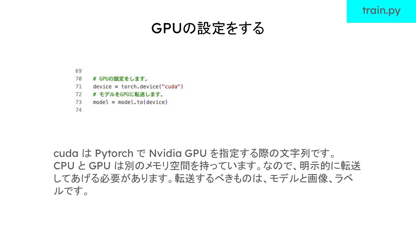 GPUの設定をする train.py cuda は Pytorch で Nvidia GPU を指定する際の文字列です。 CPU