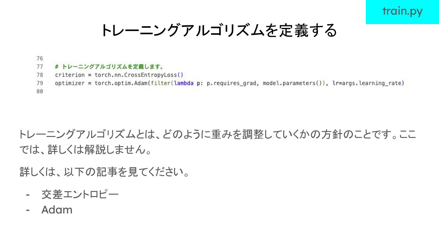 トレーニングアルゴリズムを定義する トレーニングアルゴリズムとは、どのように重みを調整していくかの方針のことです。ここ では、詳しくは解説しません。 詳しくは、以下の記事を見てください。 - 交差エントロピー - Adam train.py