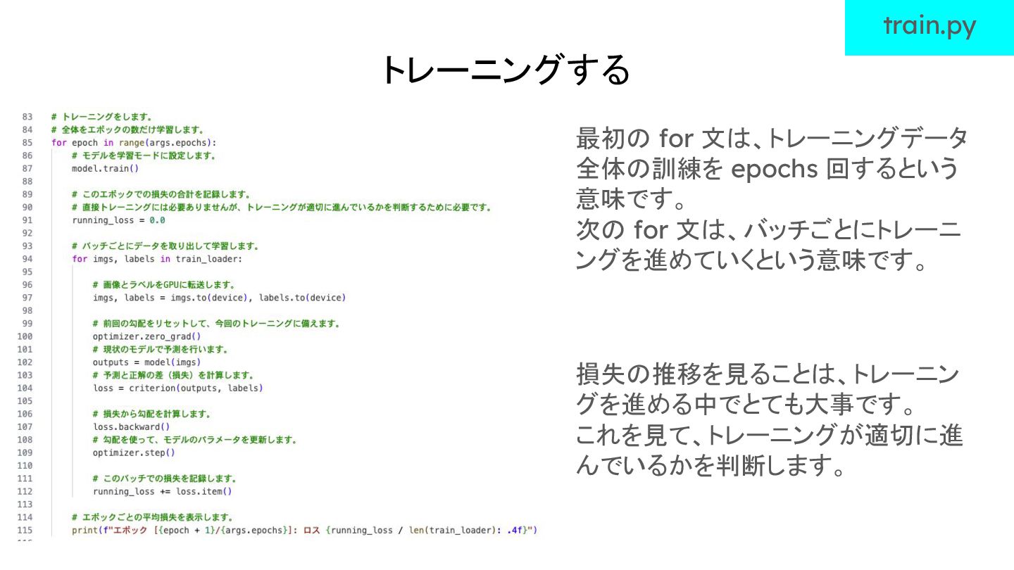 トレーニングする train.py 損失の推移を見ることは、トレーニン グを進める中でとても大事です。 これを見て、トレーニングが適切に進 んでいるかを判断します。 最初の for 文は、トレーニングデータ 全体の訓練を