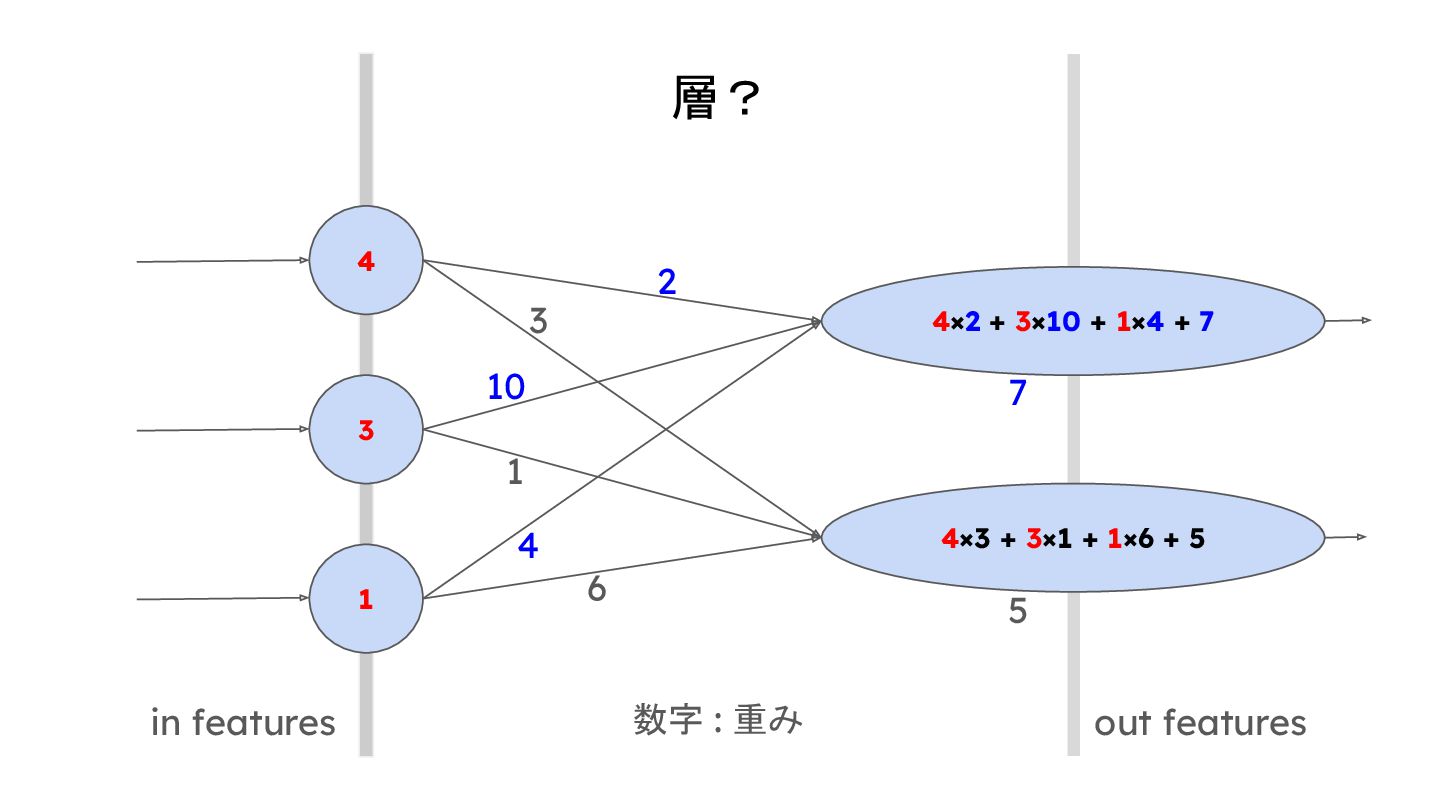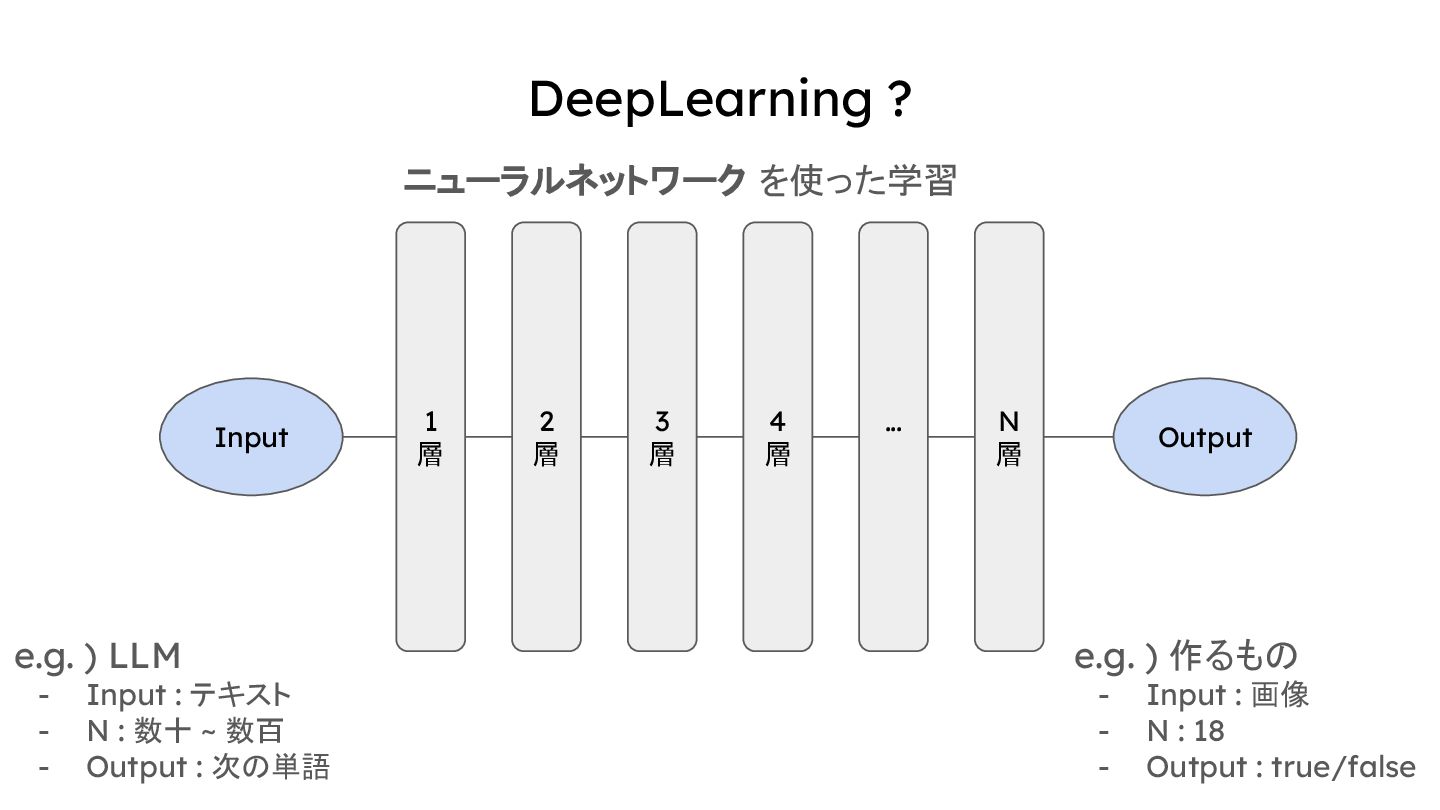 4 層 … N 層 Output e.g. ) LLM - Input : テキスト - N : 数十 ~ 数百 - Output : 次の単語 Input e.g. ) 作るもの - Input : 画像 - N : 18 - Output : true/false