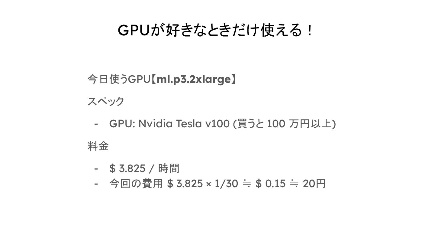 GPUが好きなときだけ使える! 今日使うGPU【ml.p3.2xlarge】 スペック - GPU: Nvidia Tesla v100 (買うと 100