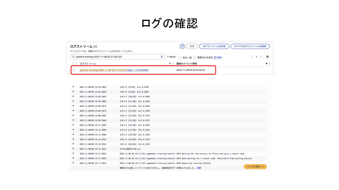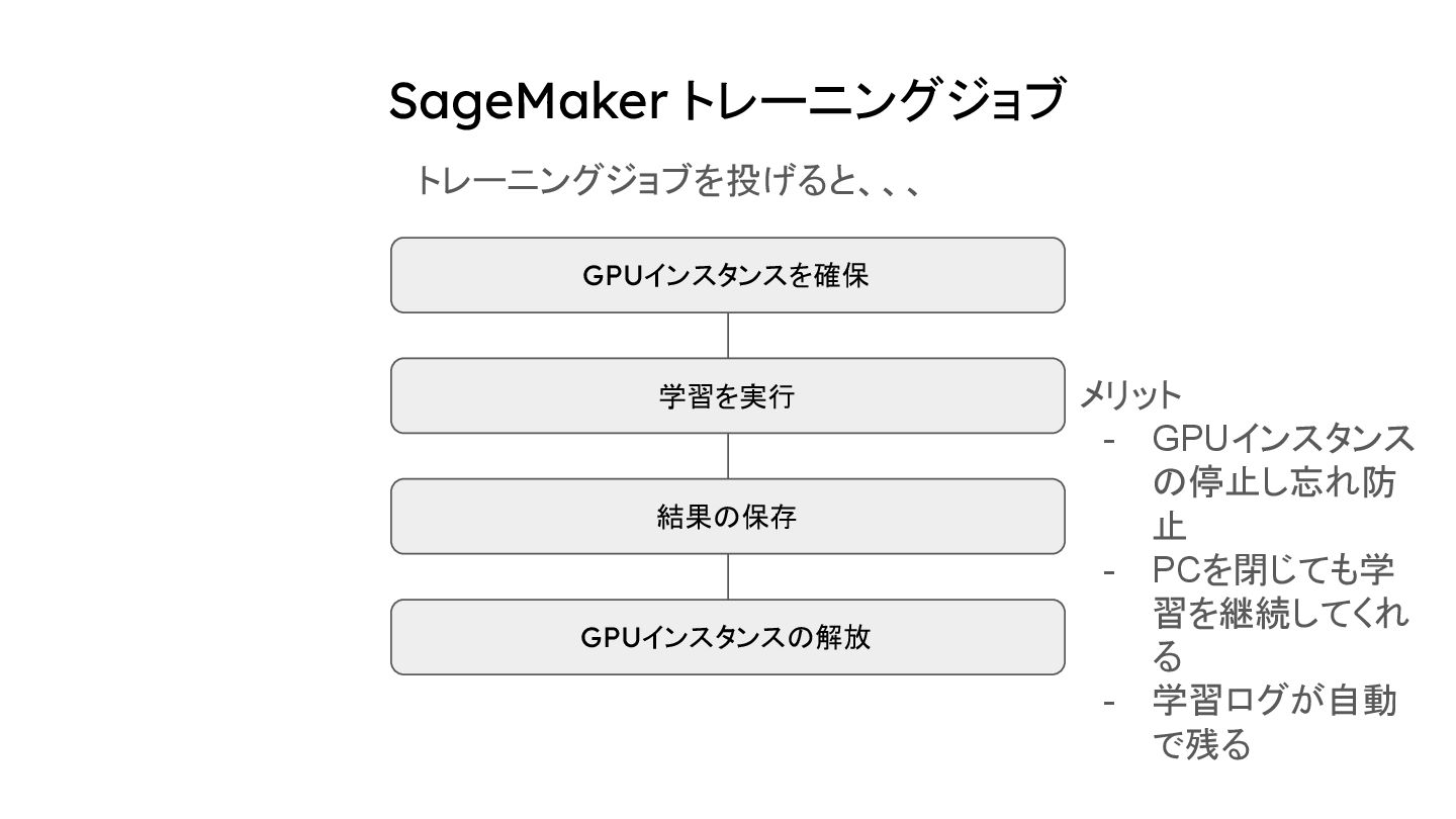 SageMaker トレーニングジョブ トレーニングジョブを投げると、、、 GPUインスタンスを確保 学習を実行 結果の保存 GPUインスタンスの解放 メリット - GPUインスタンス