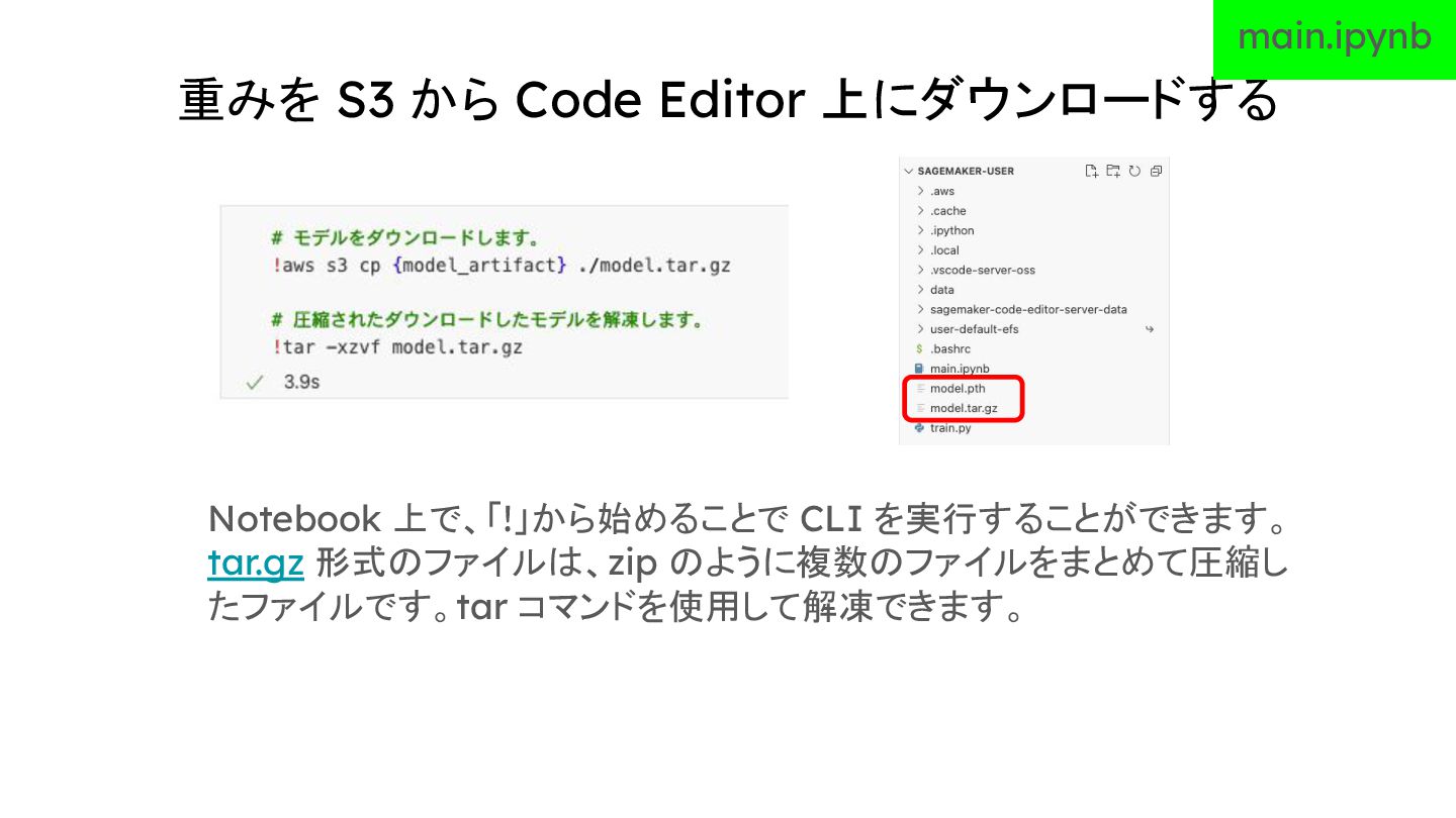 重みを S3 から Code Editor 上にダウンロードする main.ipynb Notebook 上で、「!」から始めることで CLI
