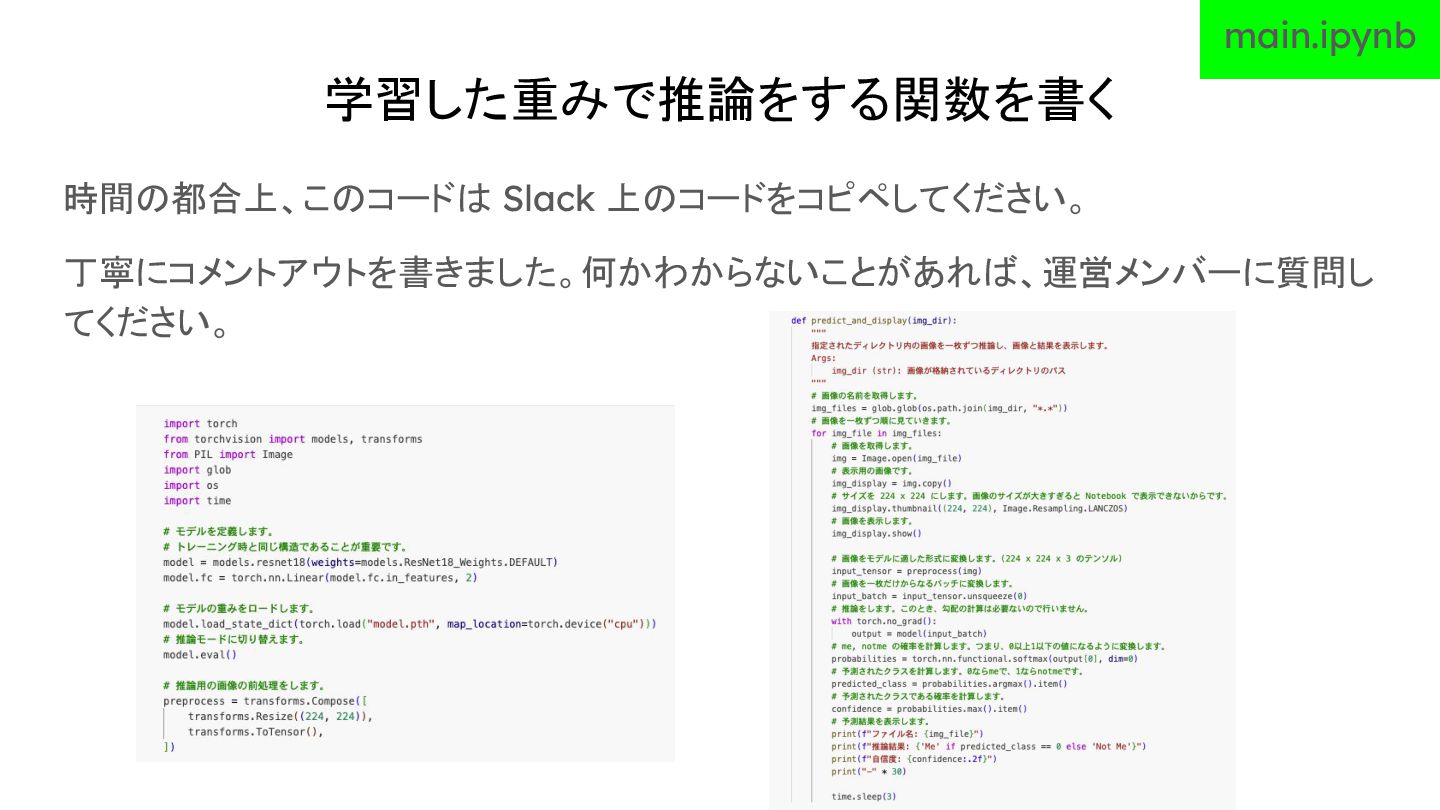 学習した重みで推論をする関数を書く 時間の都合上、このコードは Slack 上のコードをコピペしてください。 丁寧にコメントアウトを書きました。何かわからないことがあれば、運営メンバーに質問し てください。 main.ipynb