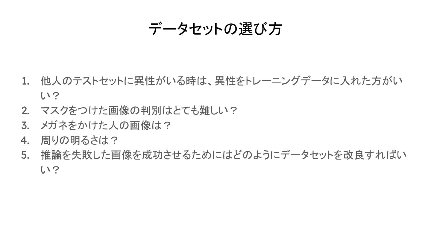 データセットの選び方 1. 他人のテストセットに異性がいる時は、異性をトレーニングデータに入れた方がい い? 2. マスクをつけた画像の判別はとても難しい? 3. メガネをかけた人の画像は? 4. 周りの明るさは?
