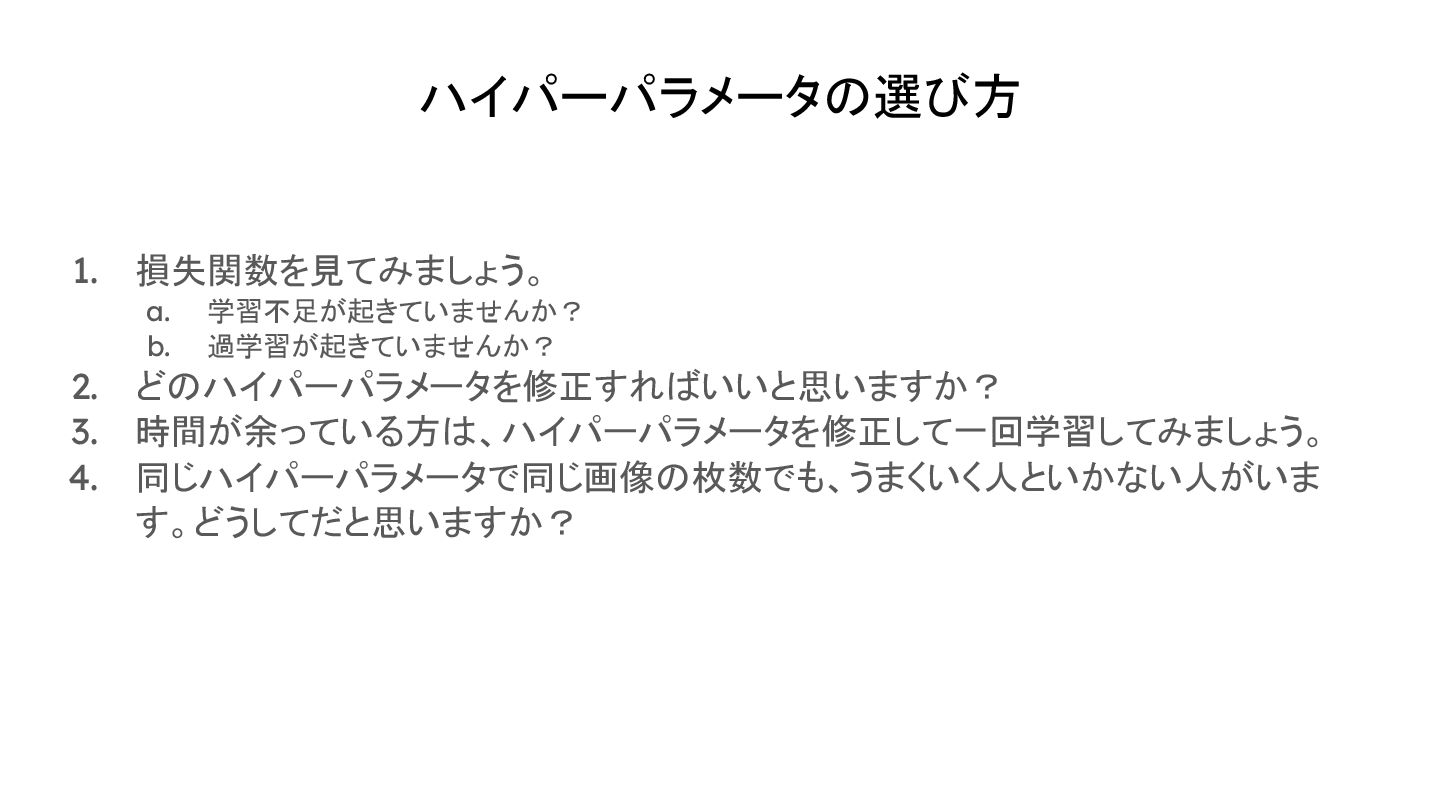 ハイパーパラメータの選び方 1. 損失関数を見てみましょう。 a. 学習不足が起きていませんか? b. 過学習が起きていませんか? 2. どのハイパーパラメータを修正すればいいと思いますか? 3.