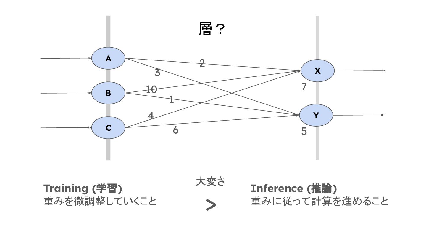4 6 7 5 Training (学習) 重みを微調整していくこと Inference (推論) 重みに従って計算を進めること 大変さ >