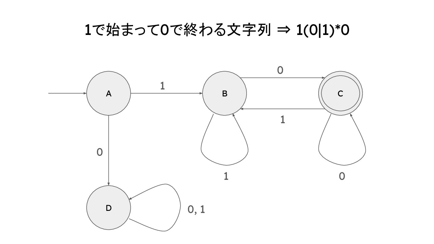 1で始まって0で終わる文字列 ⇒ 1(0|1)*0 A D C B 0 0 0