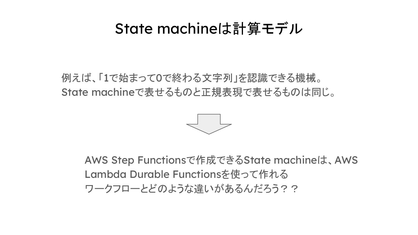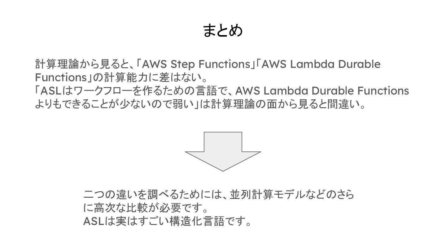 まとめ 計算理論から見ると、「AWS Step Functions」「AWS Lambda Durable Functions」の計算能力に差はない。 「ASLはワークフローを作るための言語で、AWS Lambda Durable