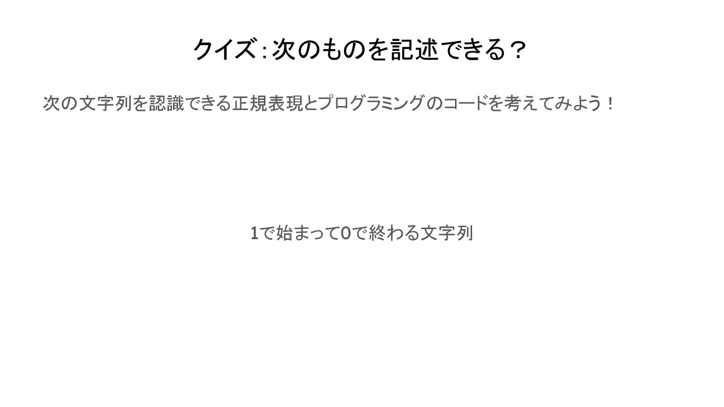 クイズ:次のものを記述できる? 次の文字列を認識できる正規表現とプログラミングのコードを考えてみよう! 1で始まって0で終わる文字列