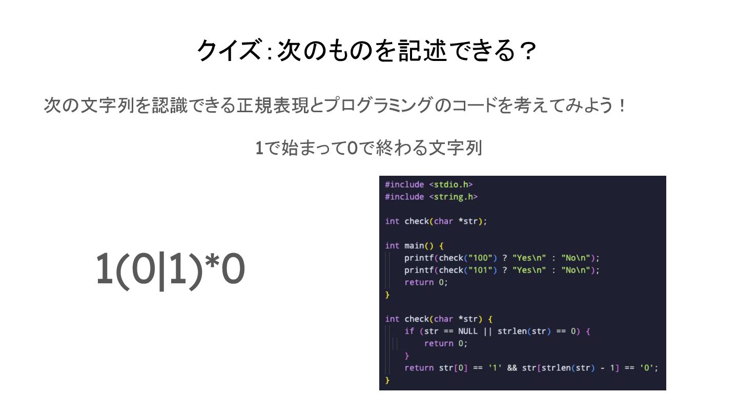 クイズ:次のものを記述できる? 次の文字列を認識できる正規表現とプログラミングのコードを考えてみよう! 1で始まって0で終わる文字列 1(0|1)*0
