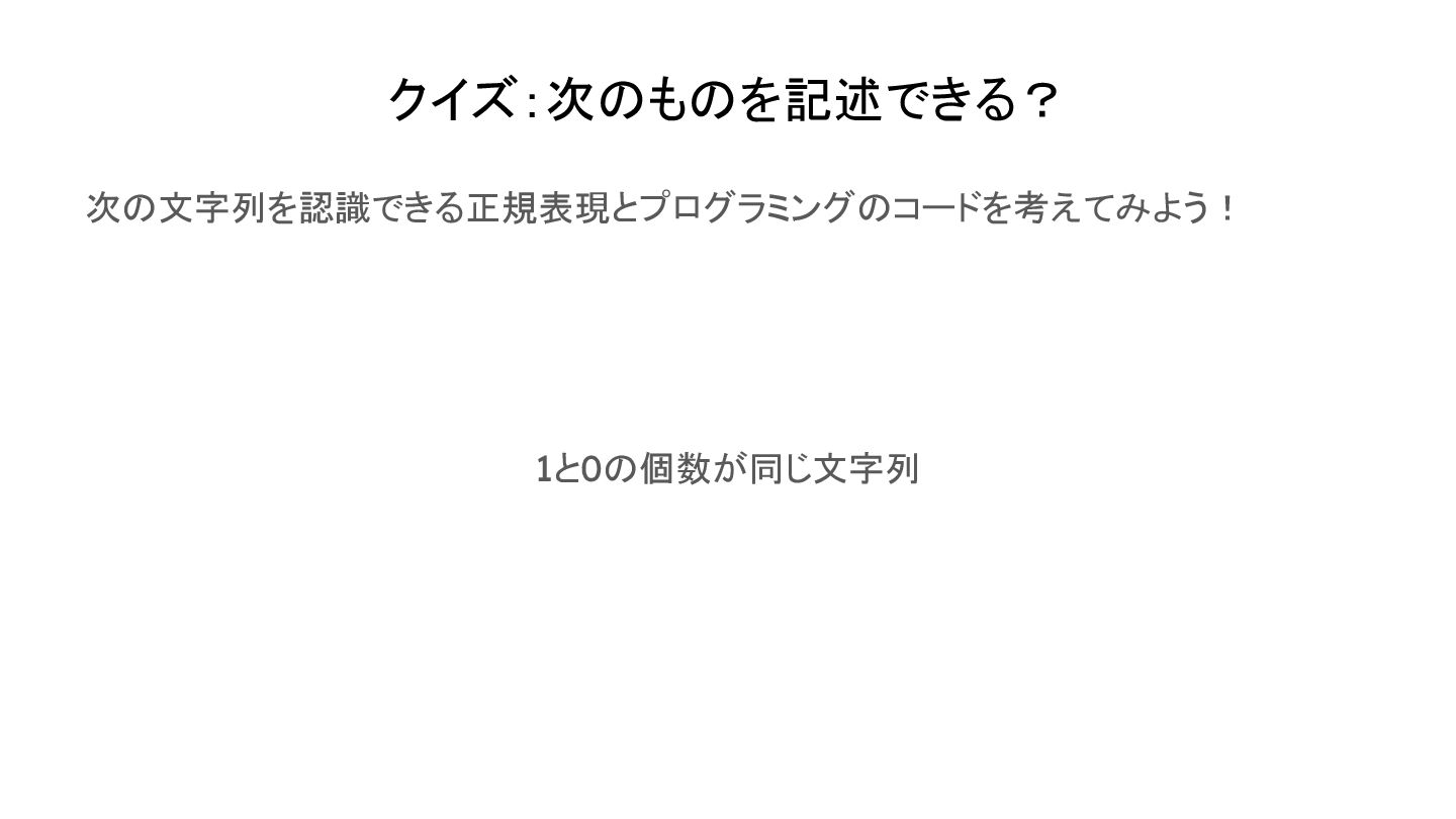 クイズ:次のものを記述できる? 次の文字列を認識できる正規表現とプログラミングのコードを考えてみよう! 1と0の個数が同じ文字列