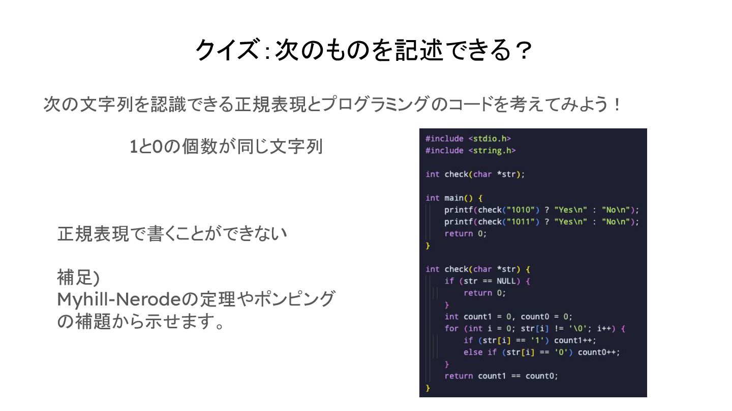 クイズ:次のものを記述できる? 次の文字列を認識できる正規表現とプログラミングのコードを考えてみよう! 1と0の個数が同じ文字列 正規表現で書くことができない 補足) Myhill-Nerodeの定理やポンピング の補題から示せます。