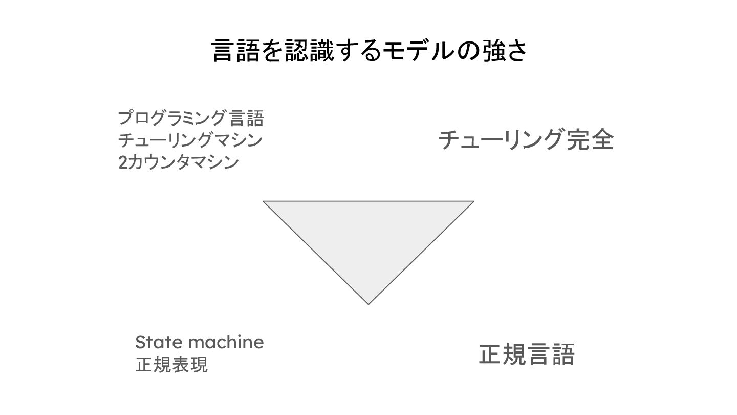 言語を認識するモデルの強さ プログラミング言語 チューリングマシン 2カウンタマシン State machine 正規表現 チューリング完全 正規言語