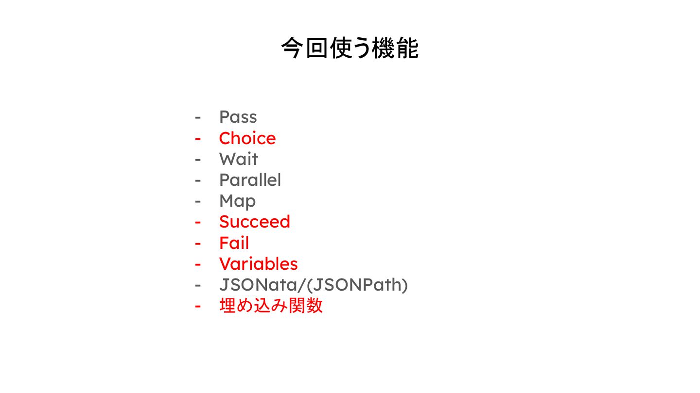 - Map - Succeed - Fail - Variables - JSONata/(JSONPath) - 埋め込み関数