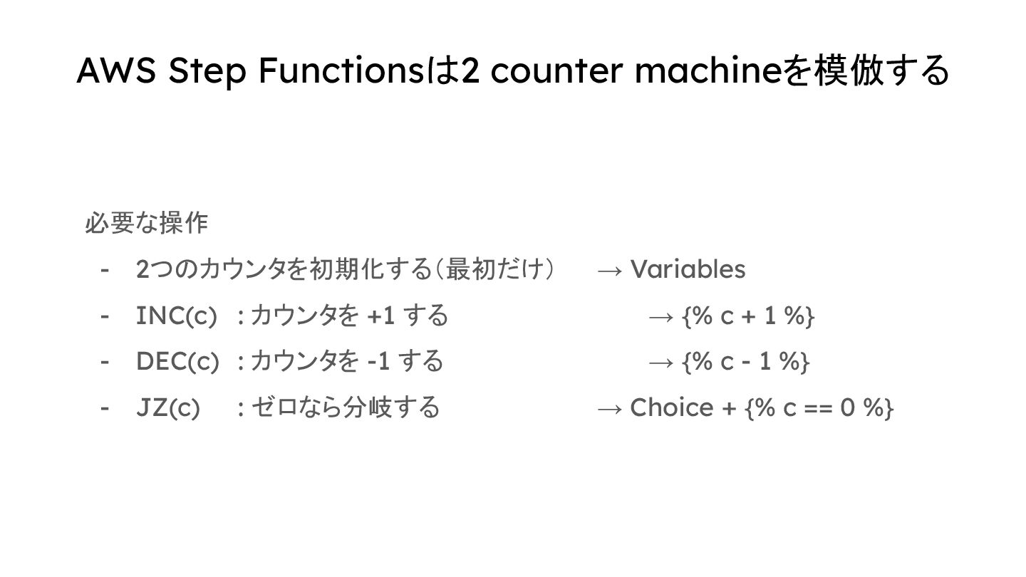 AWS Step Functionsは2 counter machineを模倣する 必要な操作 - 2つのカウンタを初期化する(最初だけ) → Variables