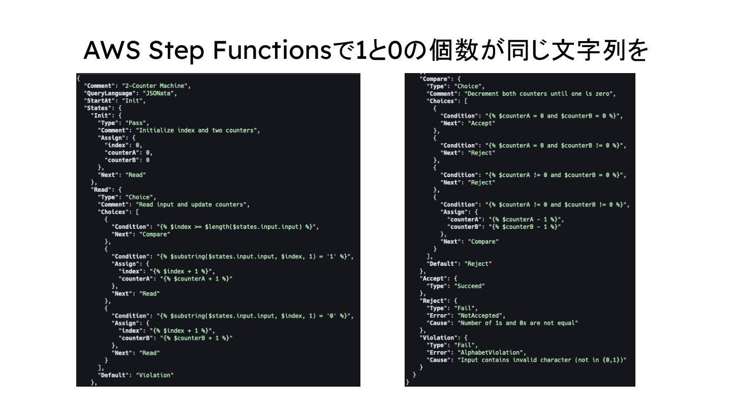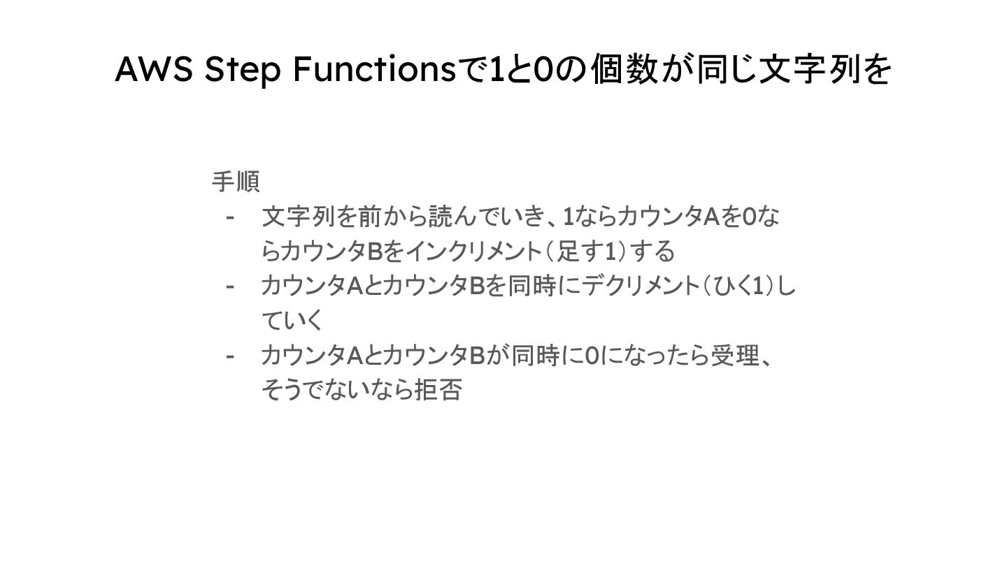 AWS Step Functionsで1と0の個数が同じ文字列を 手順 - 文字列を前から読んでいき、1ならカウンタAを0な らカウンタBをインクリメント(足す1)する - カウンタAとカウンタBを同時にデクリメント(ひく1)し ていく