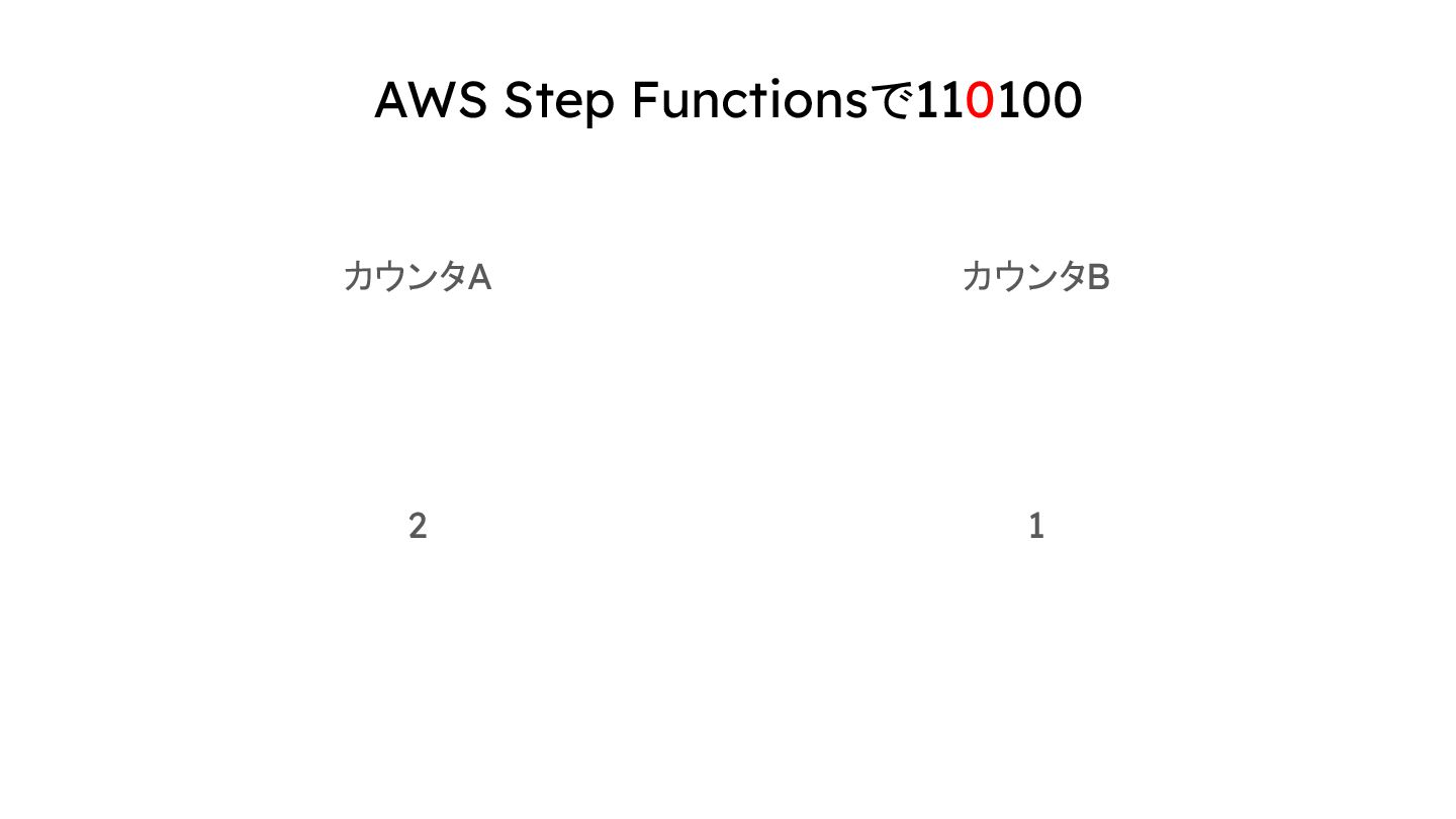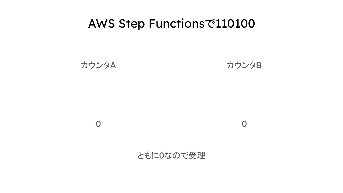 AWS Step Functionsで110100 カウンタA カウンタB 0 0 ともに0なので受理