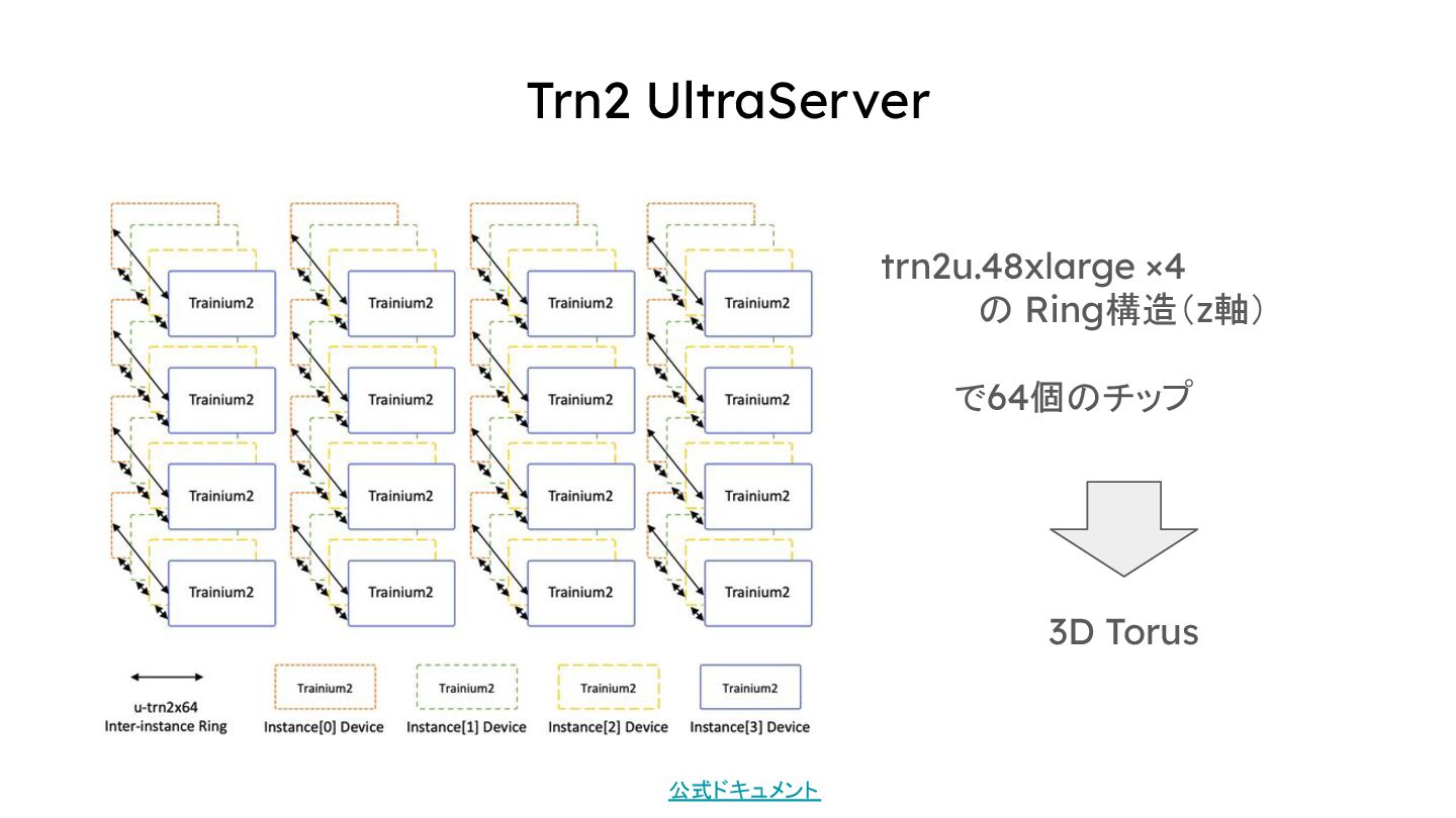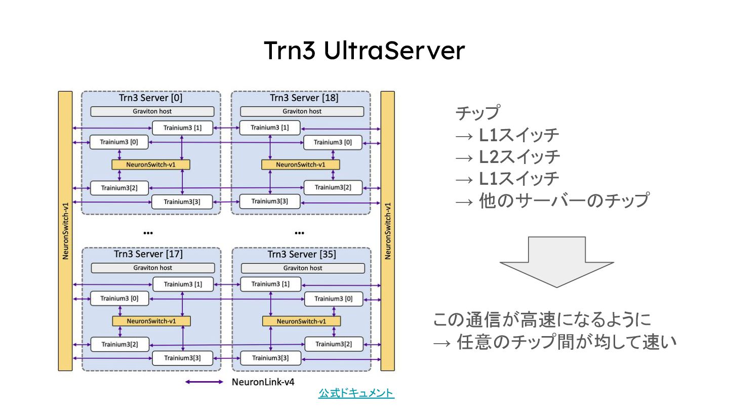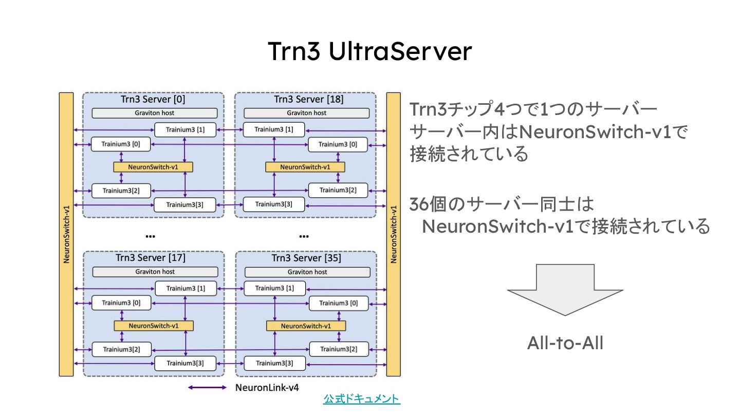 Trn3 UltraServer Trn3チップ4つで1つのサーバー サーバー内はNeuronSwitch-v1で 接続されている 36個のサーバー同士は NeuronSwitch-v1で接続されている All-to-All 公式ドキュメント