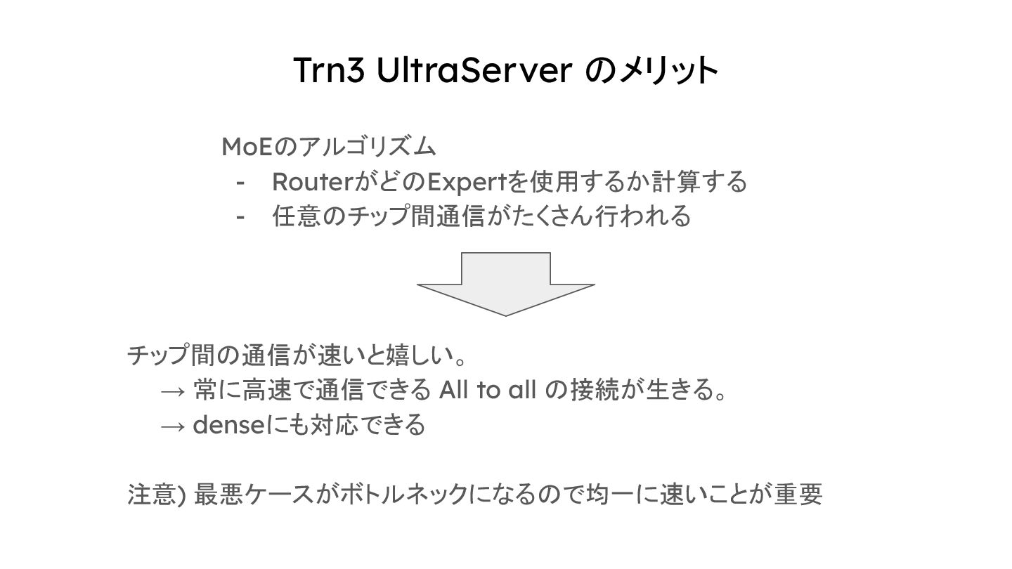 Trn3 UltraServer のメリット MoEのアルゴリズム - RouterがどのExpertを使用するか計算する - 任意のチップ間通信がたくさん行われる チップ間の通信が速いと嬉しい。 →