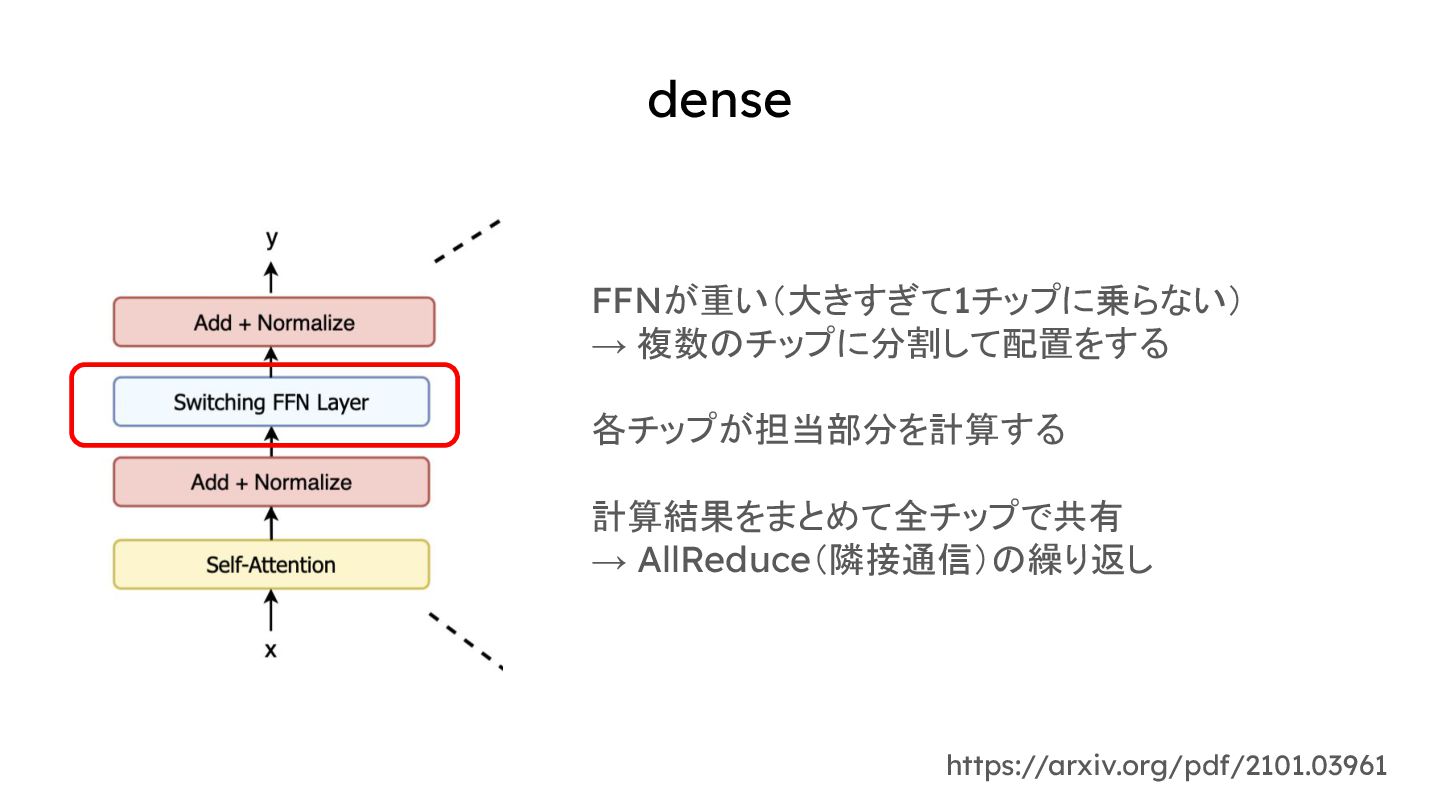 dense https://arxiv.org/pdf/2101.03961 FFNが重い(大きすぎて1チップに乗らない) → 複数のチップに分割して配置をする 各チップが担当部分を計算する 計算結果をまとめて全チップで共有 → AllReduce(隣接通信)の繰り返し