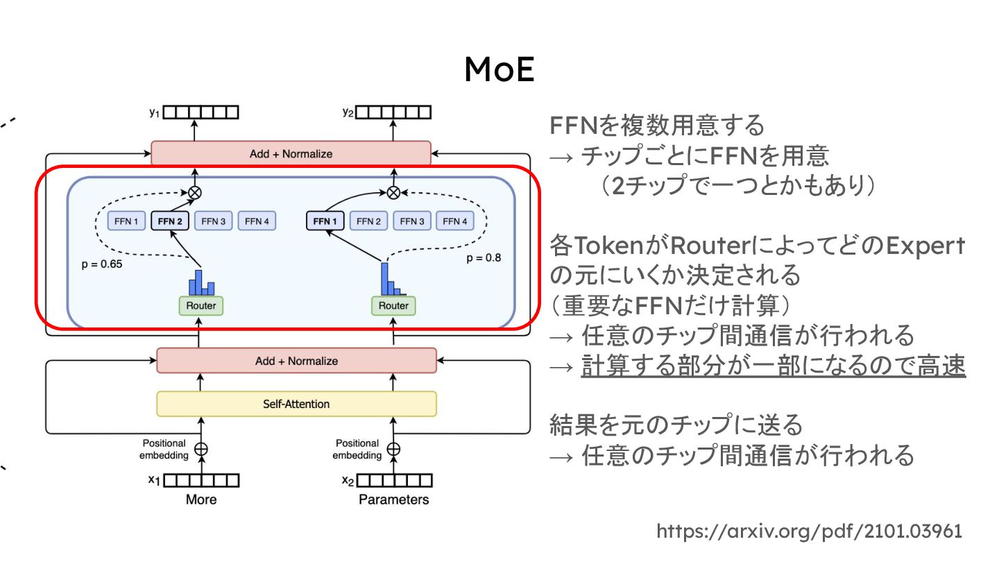 MoE https://arxiv.org/pdf/2101.03961 FFNを複数用意する → チップごとにFFNを用意 (2チップで一つとかもあり) 各TokenがRouterによってどのExpert の元にいくか決定される (重要なFFNだけ計算) →