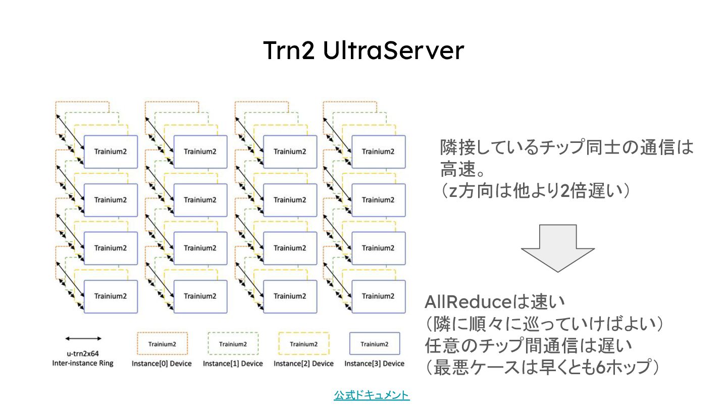 Trn2 UltraServer 隣接しているチップ同士の通信は 高速。 (z方向は他より2倍遅い) AllReduceは速い (隣に順々に巡っていけばよい) 任意のチップ間通信は遅い (最悪ケースは早くとも6ホップ) 公式ドキュメント