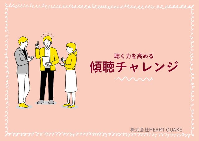 株式会社HEART QUAKE 傾聴(けいちょう) を疑似体験するゲーム 現在の聴くスキルの棚卸し よりよい傾聴のやり方の学習 傾聴/コーチング理論の基礎知識 を学ぶことが目的となります。 傾聴チャレンジはインタビューを通して 聴く力を高めるビジネスゲームです。